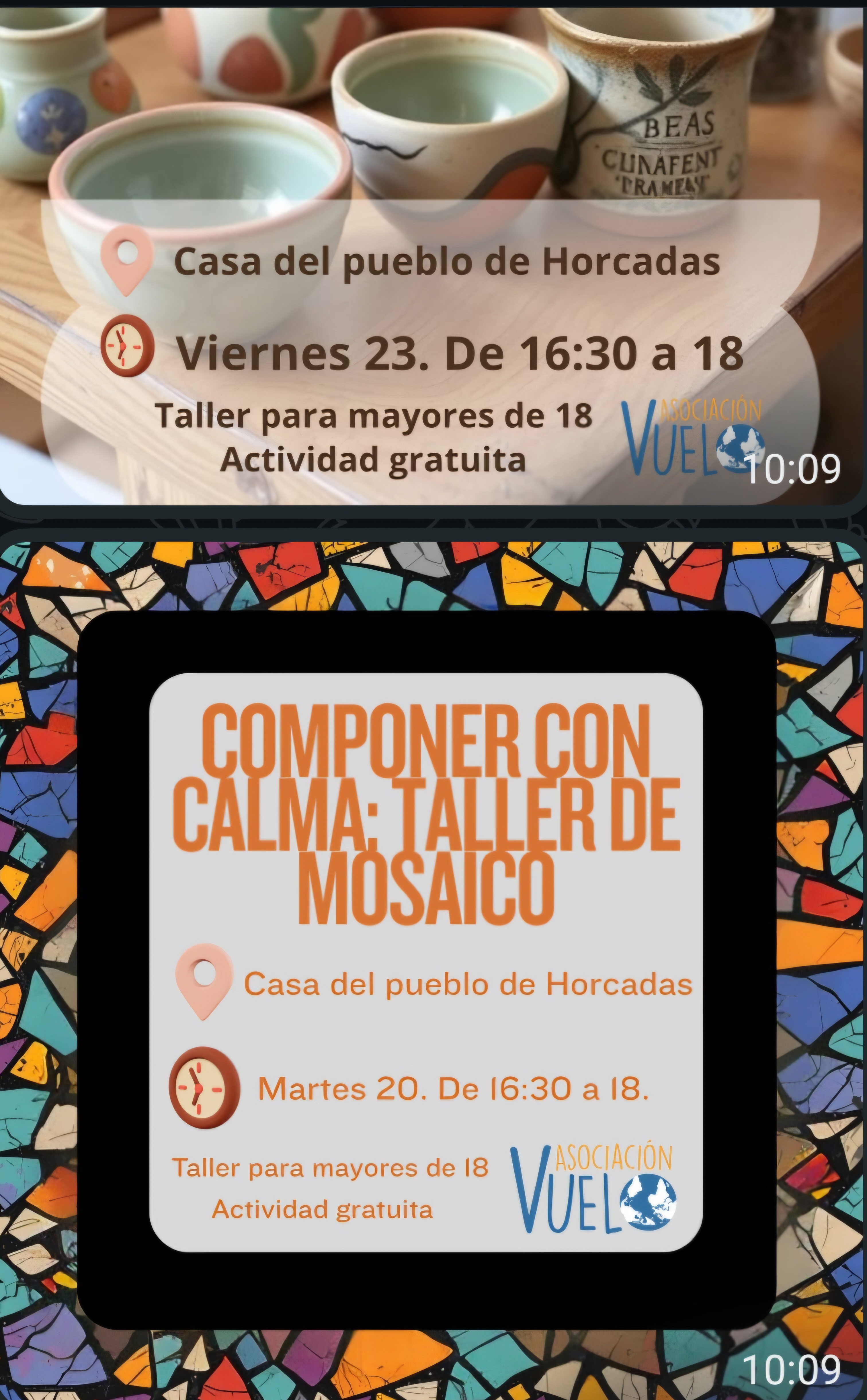 Taller de mosaico dirigido a personas adultas, centrado en la experiencia de crear pieza a pieza, experimentar con formas y colores
