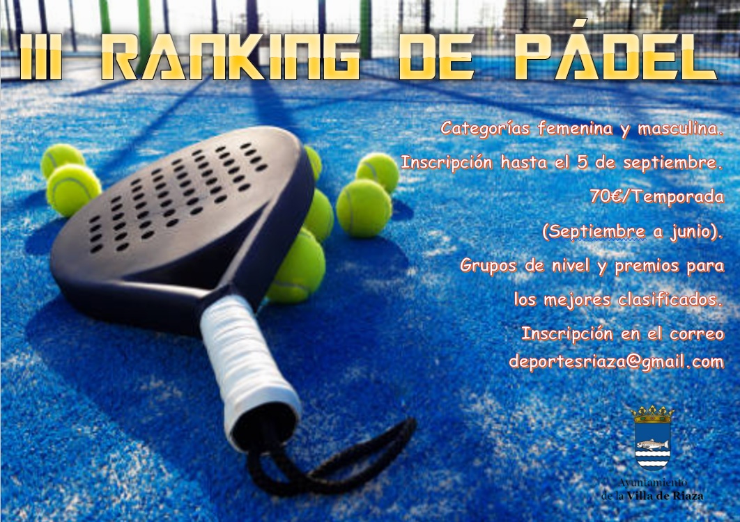 La inscripción se realizará a través del correo electrónico deportesriaza@gmail.com rellenando la solicitud hasta el 5 de septiembre (inclusive) dicha solicitud la encuentra en el siguiente enlace: https://www.riaza.es/.../iii-ranking-de-padel-riaza...