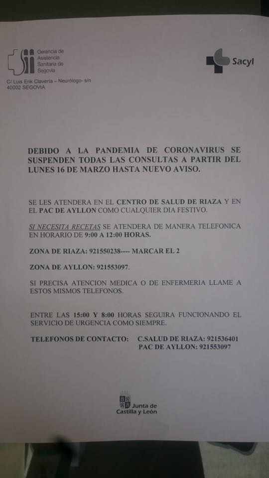 Atención en el Centro de Salud de Riaza.2020-03-13 14:27:56Info GeneralMedidas adoptadas en la Zona Básica de Salud de Riaza. A partir del lunes 16 de marzo y hasta nuevo aviso
