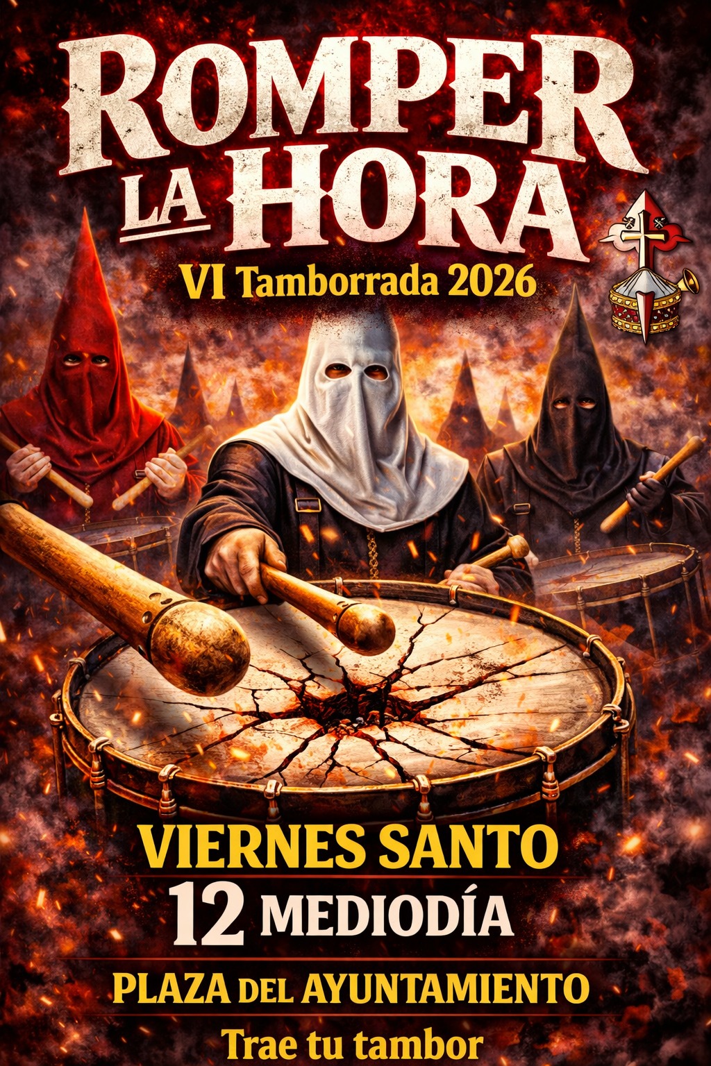 Mañana Viernes Santo, 3 de abril, a las 12:00 horas, en la Plaza de de España junto al Ayuntamiento, volverá a llenarse del sonido profundo y sobrecogedor de la VI Tamborrada de Semana Santa, “Romper la Hora”.
