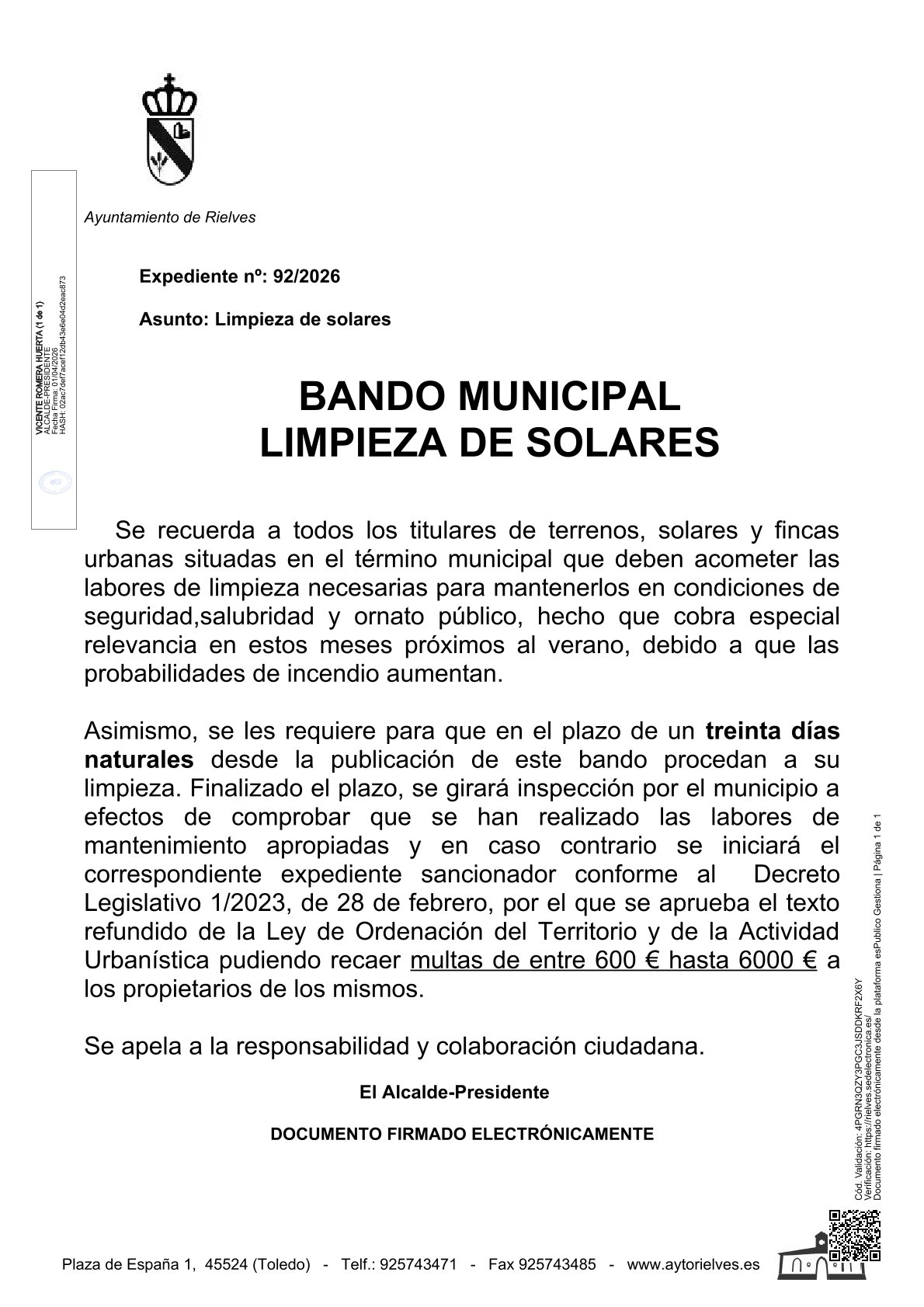 Se informa a todos los propietarios/as de solares, con el fin de preservar las adecuadas condiciones de salubridad, seguridad y ornato público, la puesta en marcha de la Campaña de limpieza de solares 2026, recordando el carácter obligatorio de estas actuaciones.