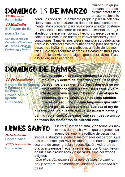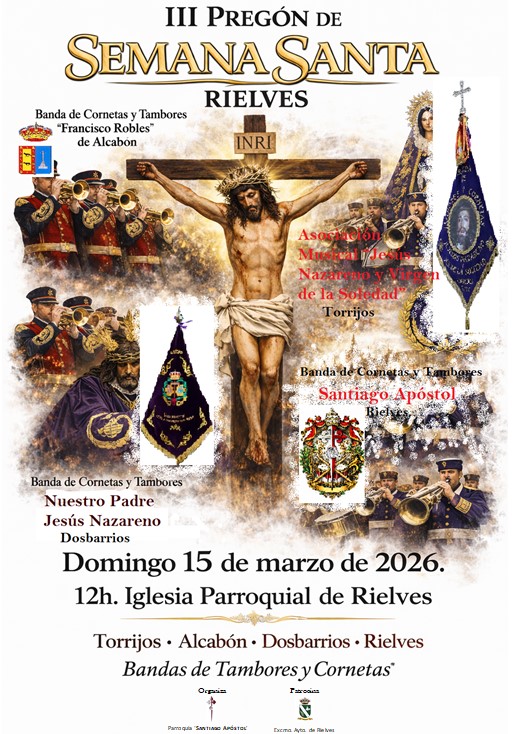 El Ayuntamiento de Rielves informa de la celebración del III Pregón de Semana Santa, que tendrá lugar el próximo domingo 15 de marzo de 2026, a las 12:00 horas, en la Iglesia Parroquial de Rielves.