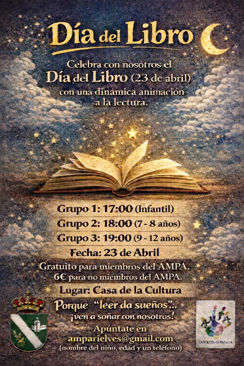 Con motivo del Día del Libro, el próximo 23 de abril, se celebrará en la Casa de la Cultura un Taller de animación a la lectura dirigida a niños y niñas de 3 a 12 años, organizado por el AMPA San Luis Gonzaga y con la colaboración del Ayuntamiento de Rielves.