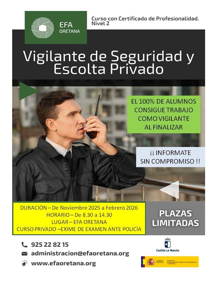 El Ayuntamiento de Rielves informa a los vecinos y vecinas de la apertura del Curso de Vigilante de Seguridad y Escolta Privado (Nivel 2), que se impartirá en la EFA Oretana en Toledo.