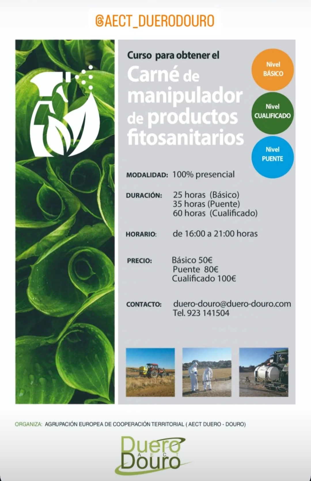 CURSOS DE MANIPULADOR DE FITOSANITARIOS AECT DUERO-DOURO2024-10-09 13:39:23Info GeneralOferta de Cursos de Manipulación de Fitosanitarios en todos sus niveles (Básico, Cualificado y Puente); de la Agrupación Duero-Douro como entidad homologada por la Junta de Castilla y León.