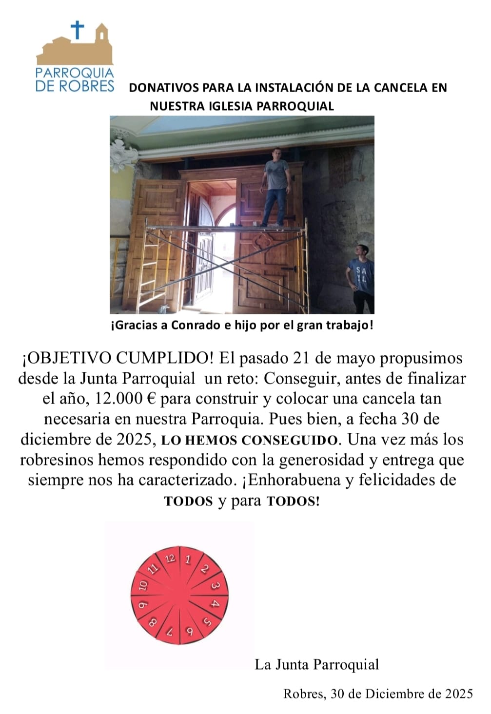 Gracias a la generosidad de los robresinos, se ha logrado alcanzar el reto solidario propuesto el pasado mes de mayo: recaudar 12.000€ para la instalación de la nueva cancela de la Iglesia Parroquial. ⛪✨