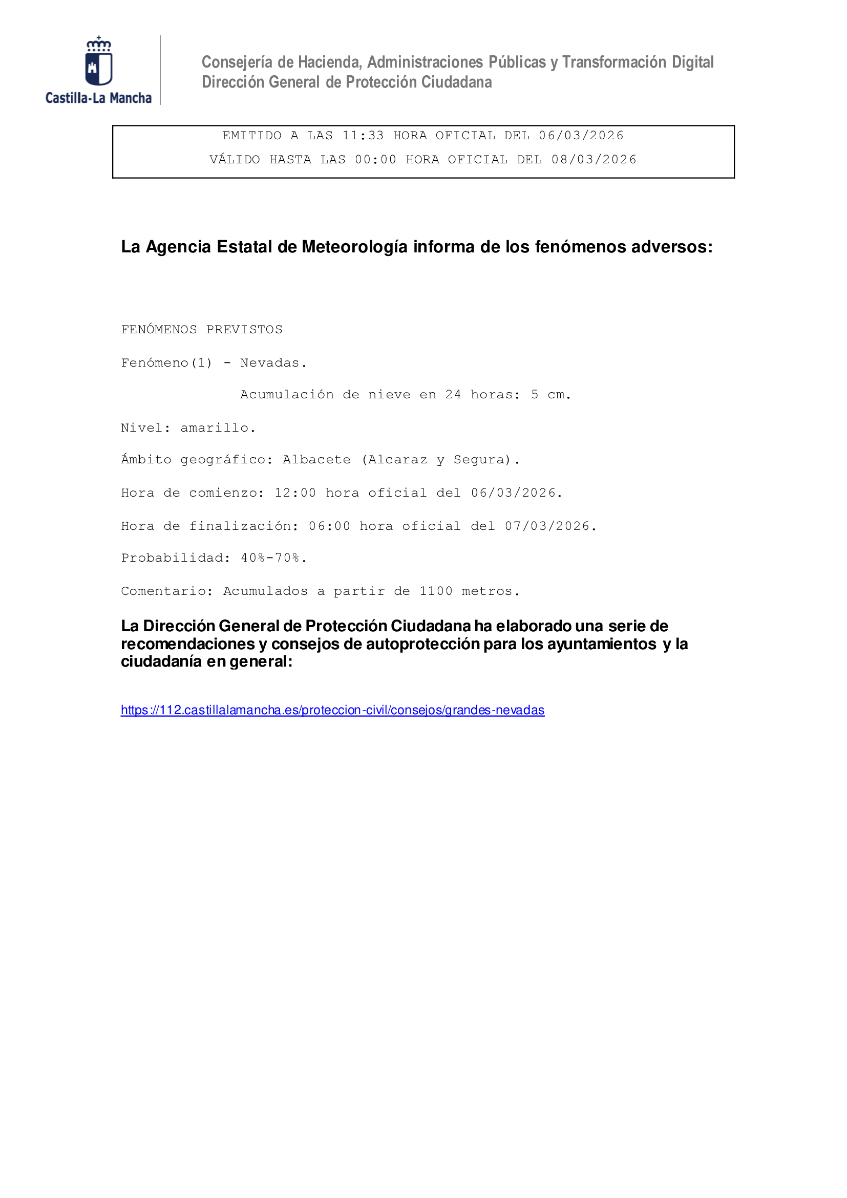 Adjunto aviso amarillo por lluvias de la AGENCIA ESTATAL DE METEOROLOGIA en la zona ALCARAZ Y SEGURAS para mañana dÍa 13 de febrero.