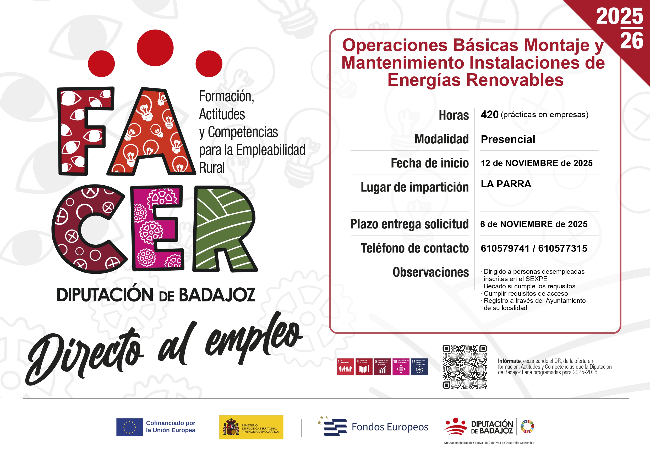 El curso que tendrá lugar en LA PARRA de Operaciones Básicas en el Montaje y Mantenimiento de Instalaciones de Energías Renovables para todo el territorio CID ZAFRA-RÍO BODIÓN y pueblos cercanos. La formación va destinada a personas en situación de desempleo.