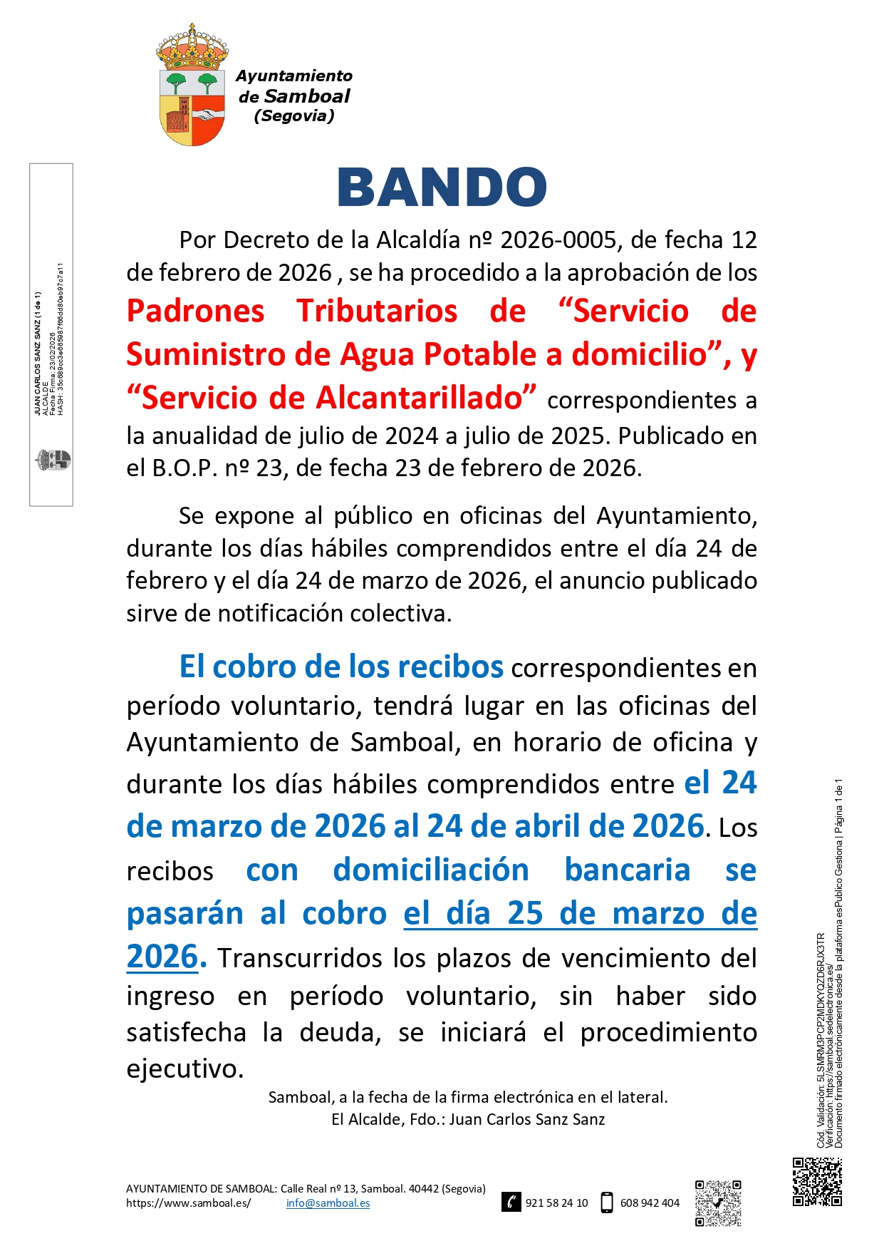 Por Decreto de la Alcaldía nº 2026-0005, de fecha 12 de febrero de 2026 , se ha procedido a la aprobación de los Padrones Tributarios de “Servicio de Suministro de Agua Potable a domicilio”, y “Servicio de Alcantarillado” correspondientes a la anualidad de julio de 2024 a julio de 2025. Publicado en el B.O.P. nº 23, de fecha 23 de febrero de 2026.