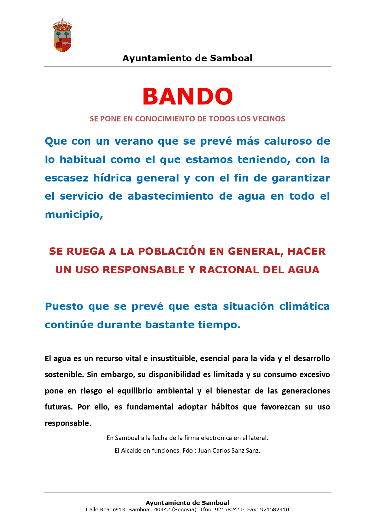 Para general conocimiento se adjunta enlace para acceder al “Proyecto de construcción de emisario y E.D.A.R. de Samboal (Segovia)” publicado en el Tablón de Anuncios de la Sede Electrónica del Ayuntamiento de Samboal: https://samboal.sedelectronica.esPROHIBIDO DEPOSITAR ASCUAS O CENIZAS CALIENTES PARA EVITAR PELIGRO DE INCENDIO EN EL DEPÓSITO DE RESTOS VEGETALES