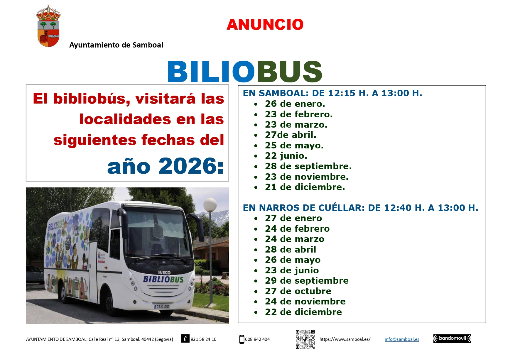 El bibliobús, visitará las localidades en las siguientes fechas del año 2026: