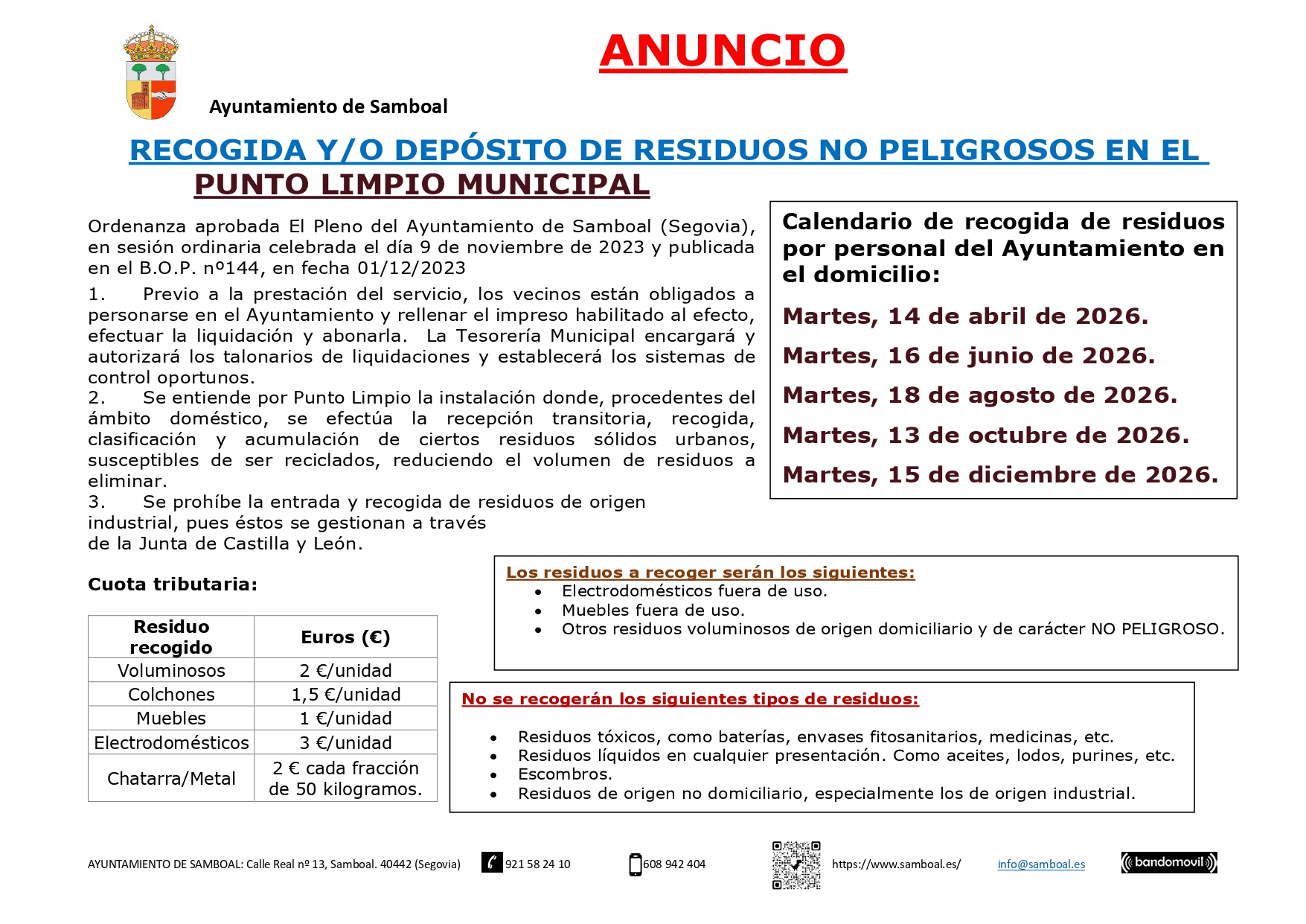📌 RECOGIDA Y/O DEPÓSITO DE RESIDUOS NO PELIGROSOS EN EL PUNTO LIMPIO MUNICIPAL 2026