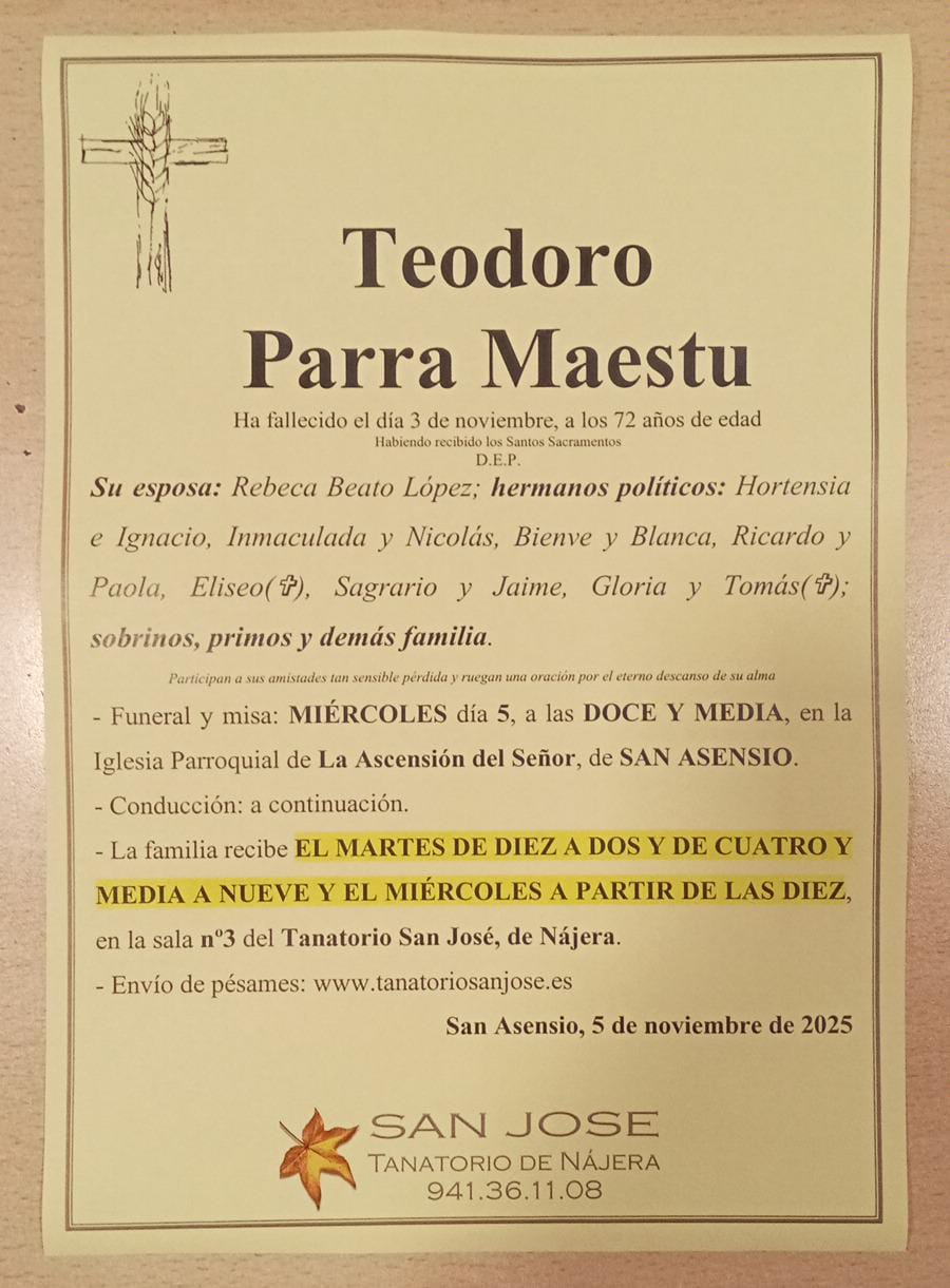 Teodoro Parra Maestu ha fallecido a los 72 años de edad.