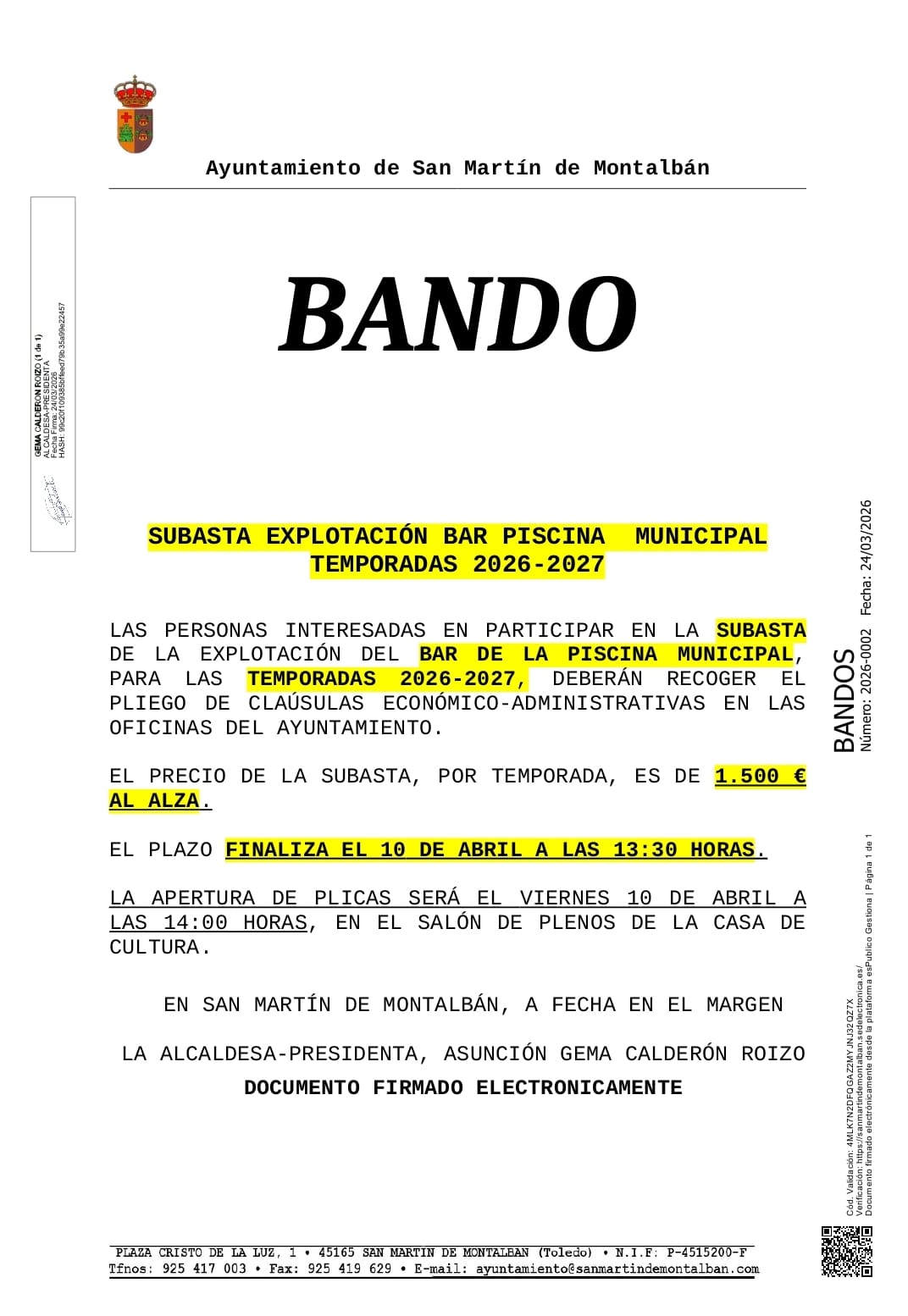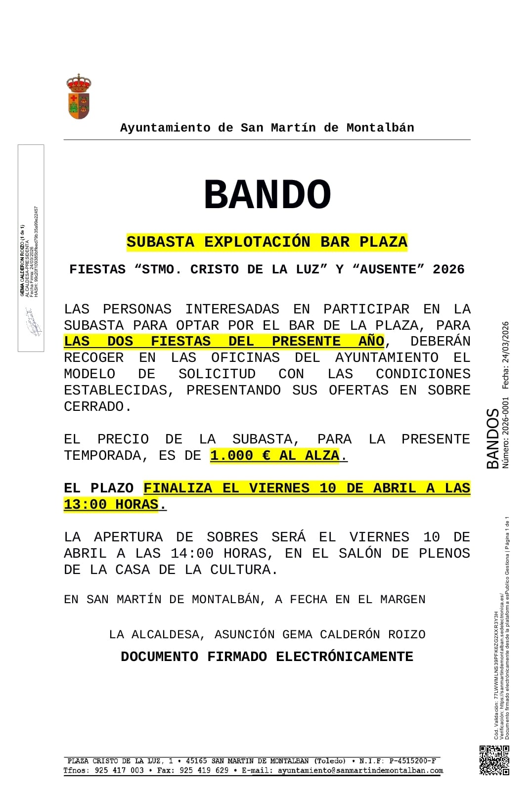 Apertura de ofertas a las 14:00h en el Ayuntamiento