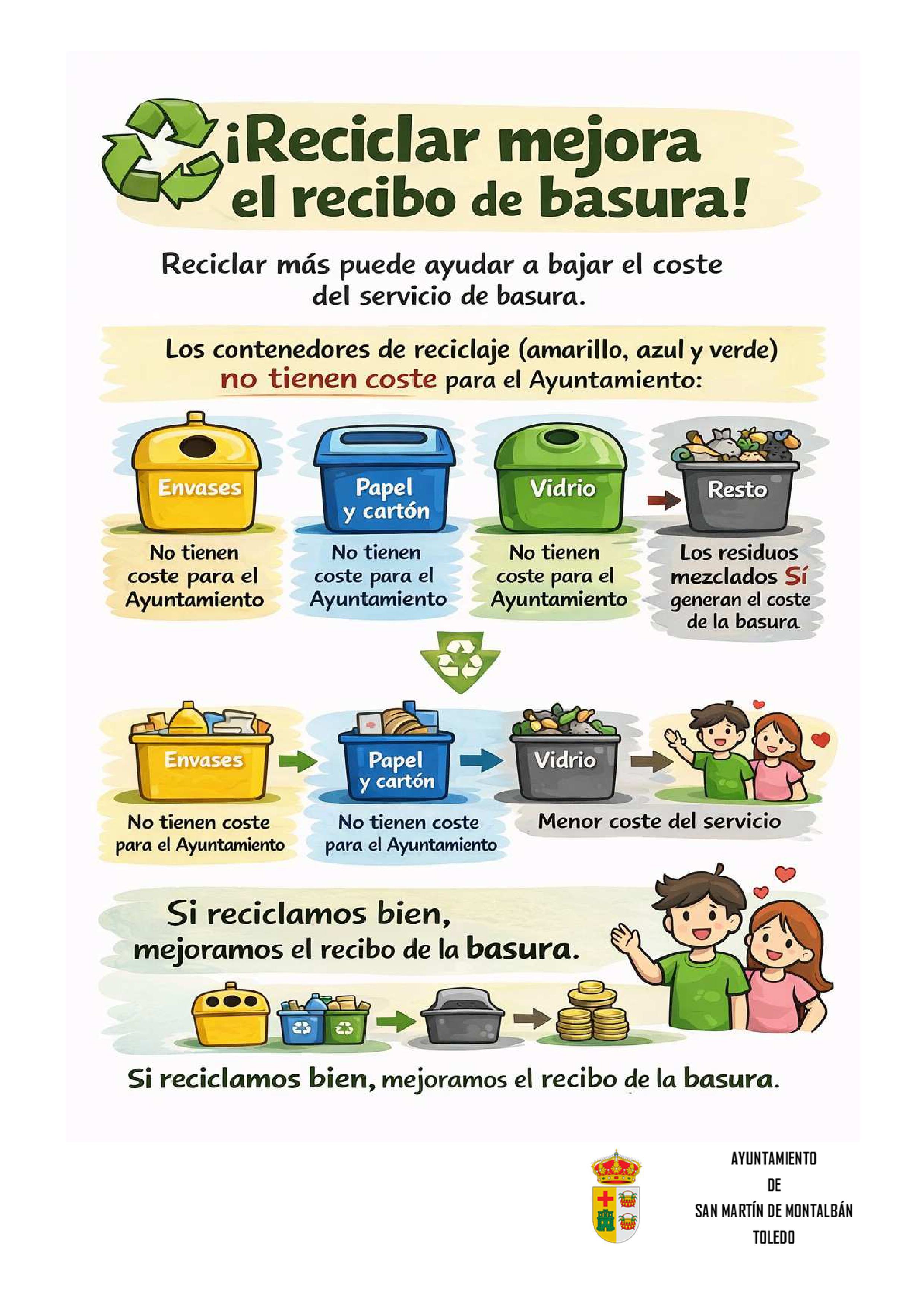 Separar bien los residuos ayuda a reducir el coste del servicio. Los contenedores de envases 🟡, papel 🔵 y vidrio 🟢 no generan coste para el Ayuntamiento, mientras que la basura mezclada ⚫ sí lo hace.