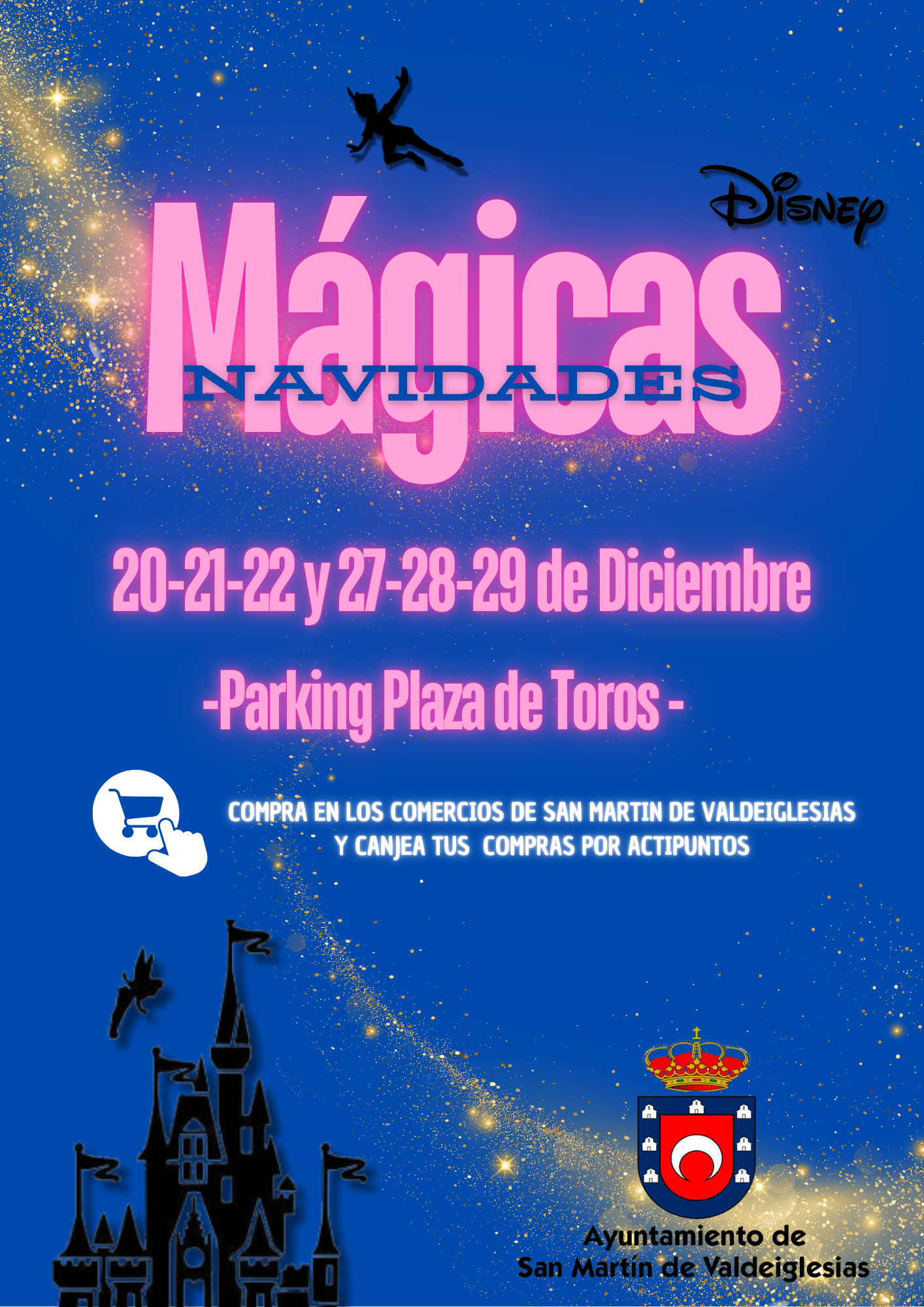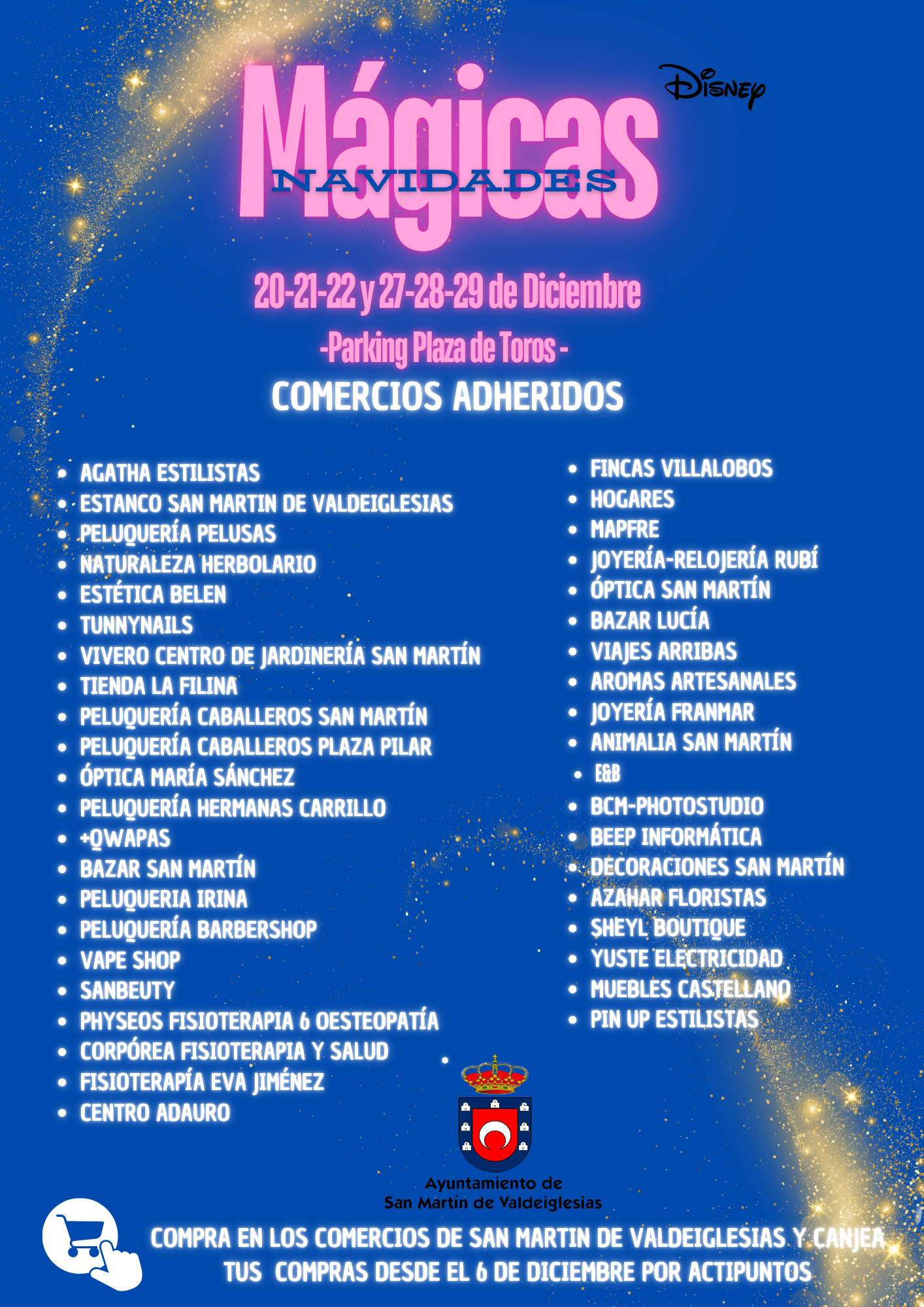 Campaña de apoyo al comercio local y la dinamización empresarial2024-12-03 13:58:52Info GeneralLa campaña tiene por objeto promover, promocionar e impulsar el comercio local y la dinamización empresarial, así como la visualización de la campaña “Mágicas Navidades Disney” de San Martín de Valdeiglesias desde el 6 de diciembre hasta el 29 de diciembre de 2024.