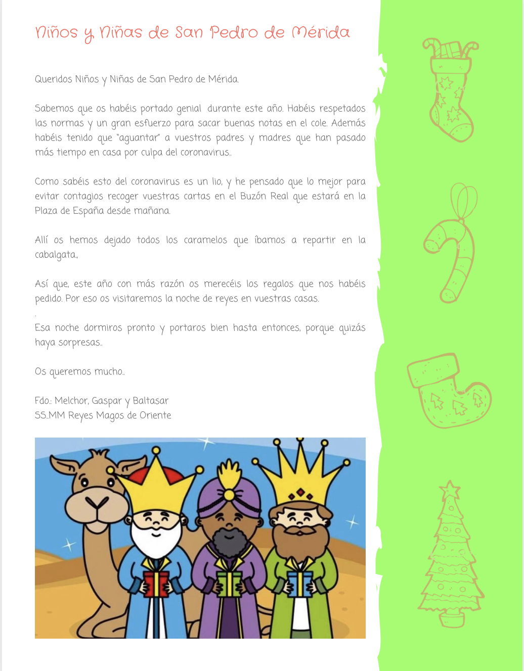 Buzón Real (horarios) y Visita de los Reyes Magos2021-01-03 19:59:44Info GeneralCOMUNICADO DE SS.MM LOS REYES MAGOS DE ORIENTE PARA TODOS LOS NIÑOS DE SAN PEDRO DE MÉRIDA.