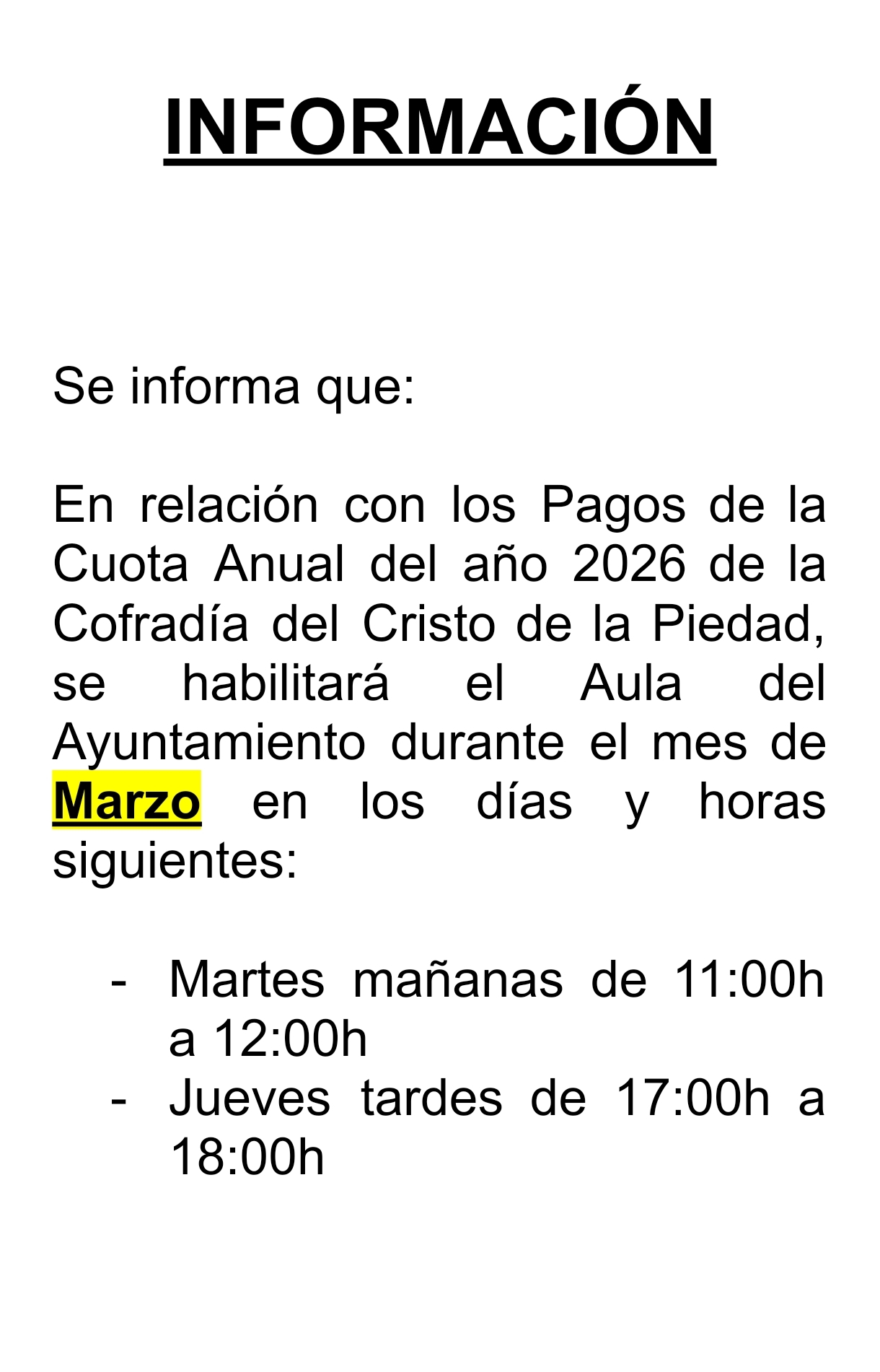 Se informa que, con motivo del abono de la Cuota Anual correspondiente al año 2026, durante el mes de MARZO se habilitará el Aula del Ayuntamiento para tal fin en los siguientes días y horarios: