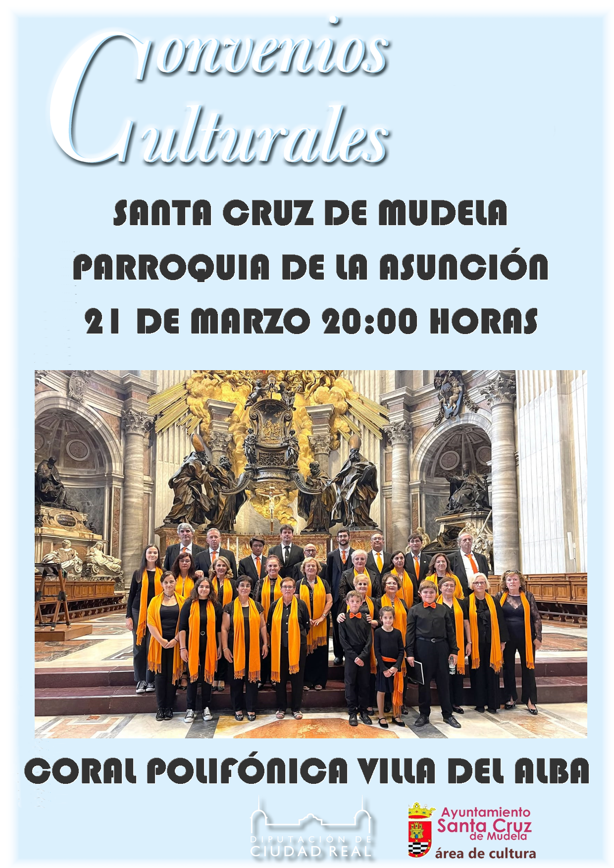El Ayuntamiento informa que, dentro de la programación de los Convenios Culturales de la Diputación de Ciudad Real, este sábado día 21 de marzo, a partir de las 20:00 horas, tendrá lugar en la Parroquia de la Asunción de nuestra localidad, la actuación de la Agrupación Coral Villa del Alba.