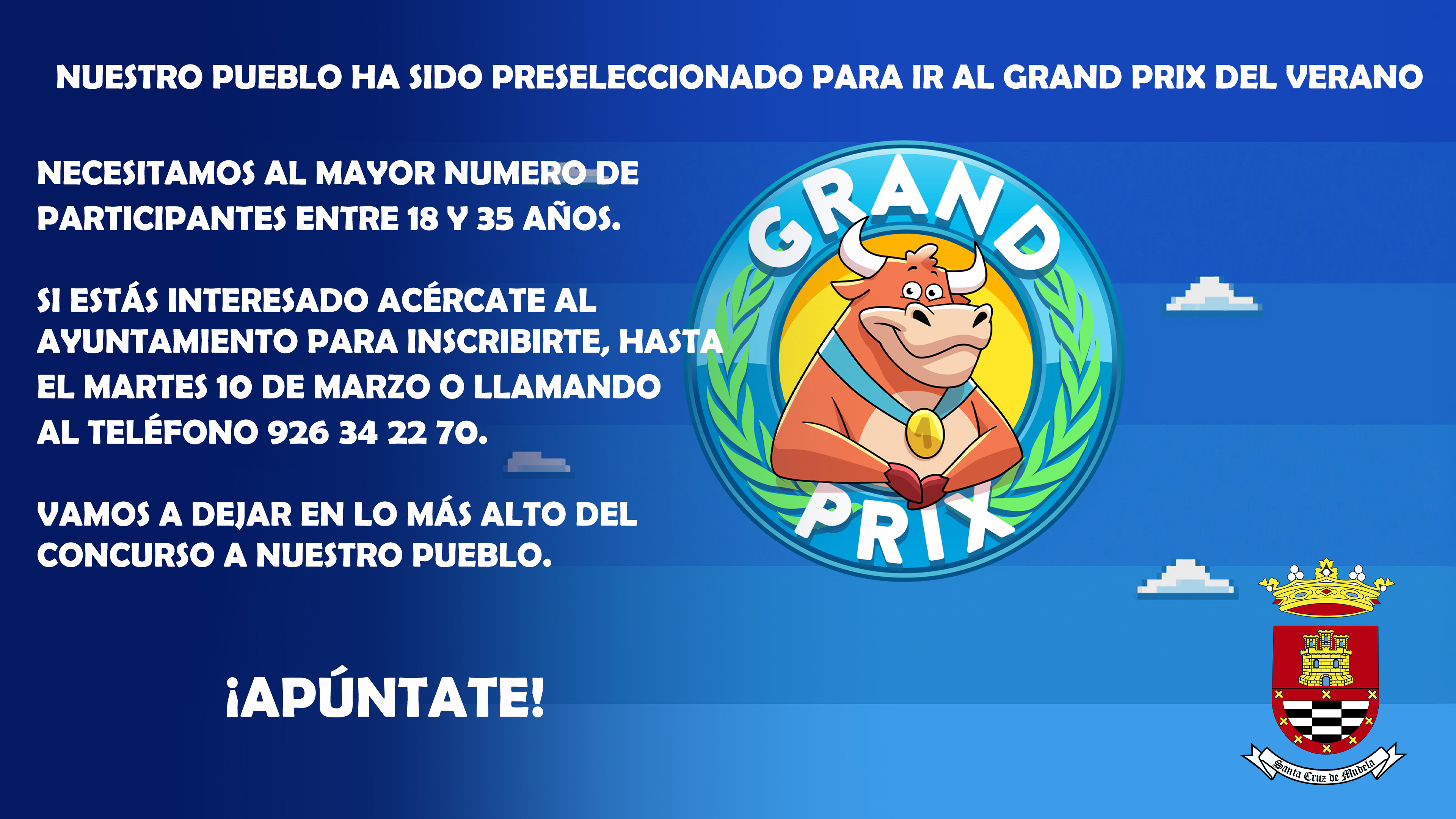 📢 El Ayuntamiento ha sido invitado a la preselección para participar en el concurso Grand Prix. Buscamos el mayor número posible de personas entre 18 y 35 años para representar al municipio.