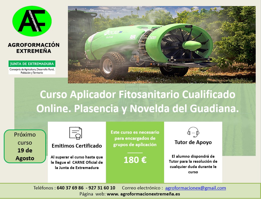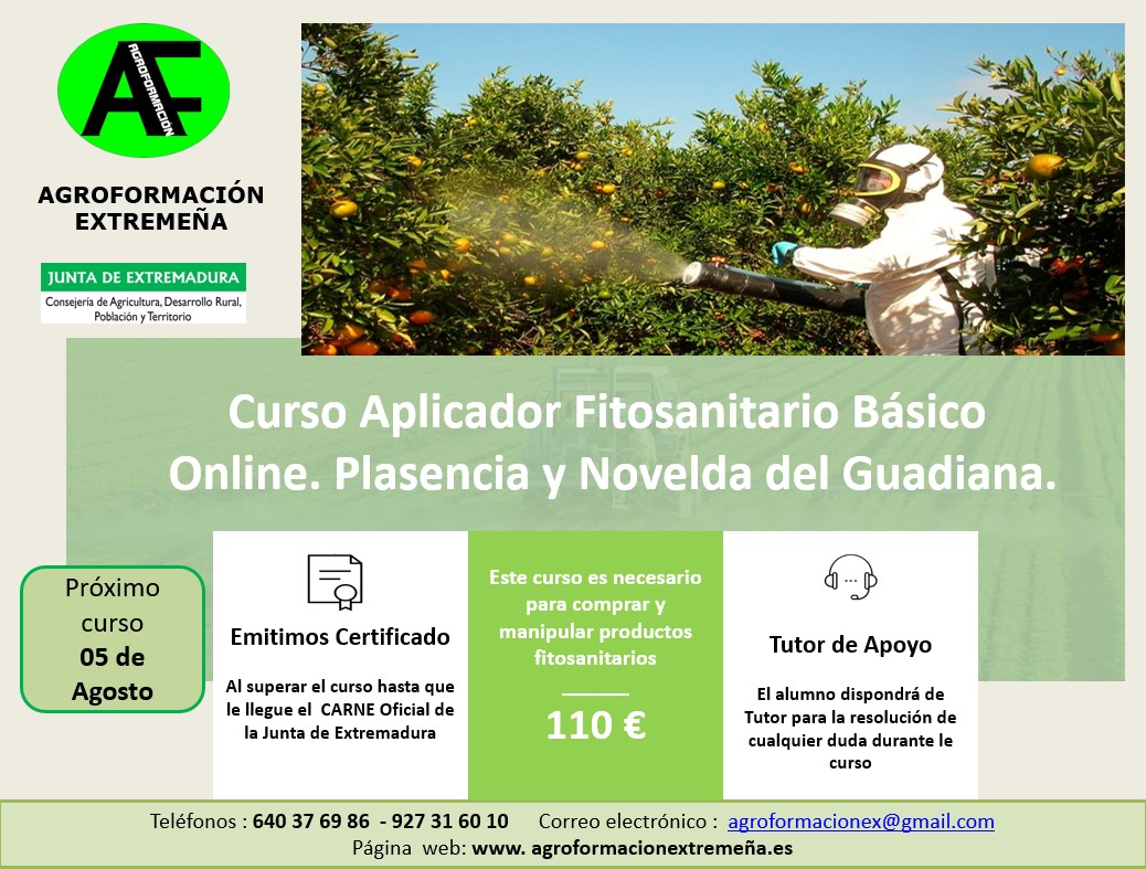 * Día 19 de Agosto el curso de Aplicador de Productos Fitosanitarios Online. Nivel Cualificado en Plasencia y Novelda del Guadiana.