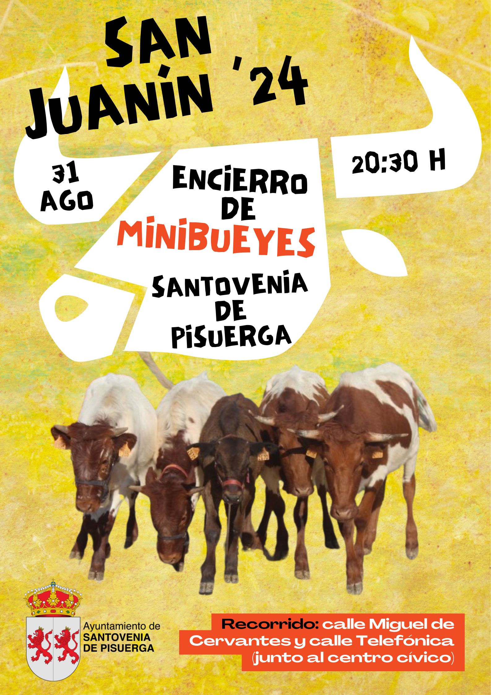 ENCIERRO DE MINIBUEYES | SÁBADO, 31 DE AGOSTO (20:30 H)2024-08-16 12:44:22CulturaEste año, como parte de la programación de San Juanín, podremos disfrutar de un encierro de minibueyes que discurrirá por las calles Miguel de Cervantes y Telefónica, junto al Centro Cívico Santovenia.