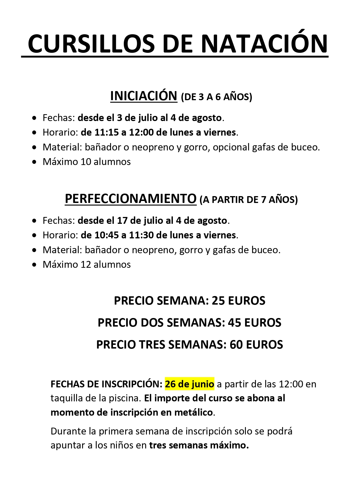 Inscripciones desde el 26 de junio a las 12:00 horas en la taquilla de la piscina. El importe del curso se abonará en metálico en el momento de la inscripción.