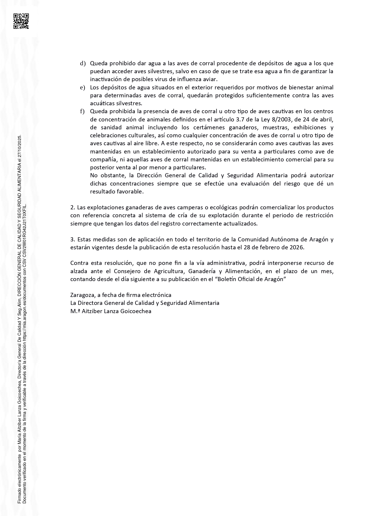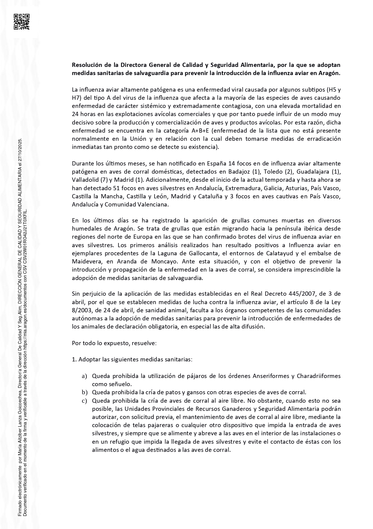 Se adjunta Resolución de la Directora General de Calidad y Seguridad Alimentaria, por la que se adoptan medidas sanitarias de salvaguardia para prevenir la introducción de la influenza aviar en Aragón, en particular " queda prohibida la cría de aves de corral al aire libre ".