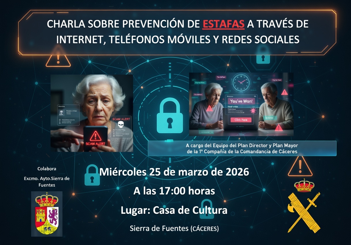 Esta tarde en la Casa de Cultura se realizará una charla informativa, a cargo del Equipo del Plan Director y Plan Mayor de la 1ª Compañía de la Comandancia de la Guardia Civil de Cáceres, para aprender a detectar las estafas a través de Internet, teléfonos móviles y redes sociales.