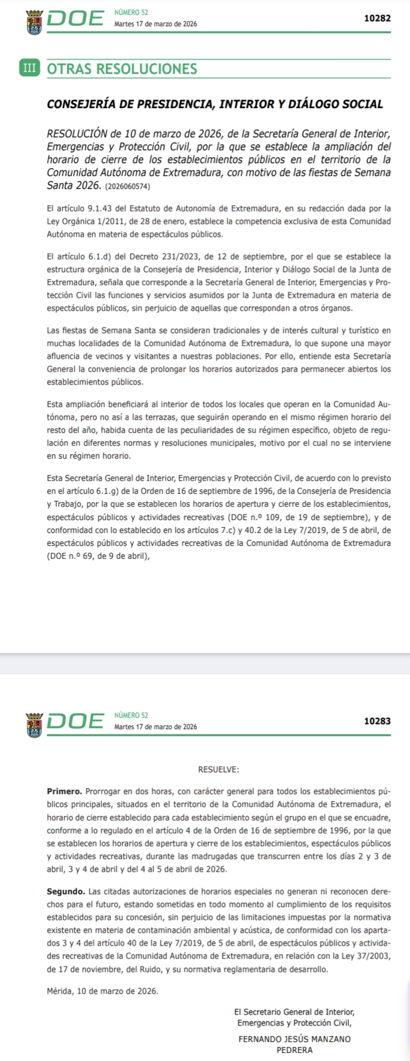 Adjuntamos Resolución de 10 de marzo de 2026, de la Secretaria General de Interior, Emergencias y Protección Civil de la Junta de Extremadura, por la que se establece la ampliación de 2 horas del horario de cierre de los establecimientos públicos en el territorio de la Comunidad Autónoma de Extremadura, con motivo de las fiestas de Semana Santa, desde el 2 al 5 de abril de 2026.