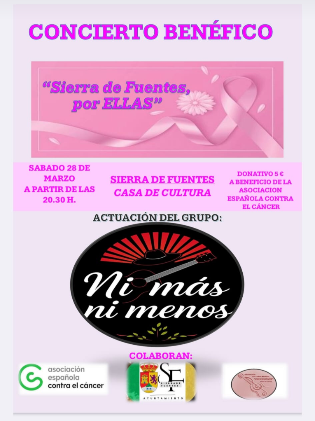El próximo sábado 28 de marzo, a las 20:30 horas, la Casa de Cultura de Sierra de Fuentes acogerá el concierto benéfico “Sierra de Fuentes, por ellas”, una cita solidaria organizada a beneficio de la Asociación Española Contra el Cáncer.