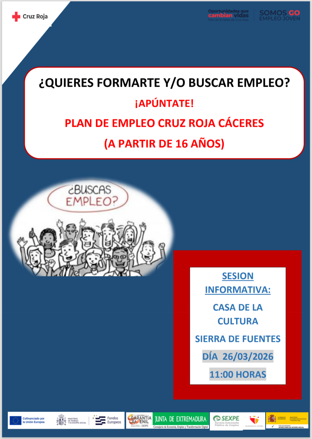 Sesión Informativa*Plan de Empleo Cruz Roja de Cáceres* cofinanciado por el FSE dirigida a personas a partir de 16 años interesadas en mejorar su empleabilidad y acceder a nuevas oportunidades laborales.