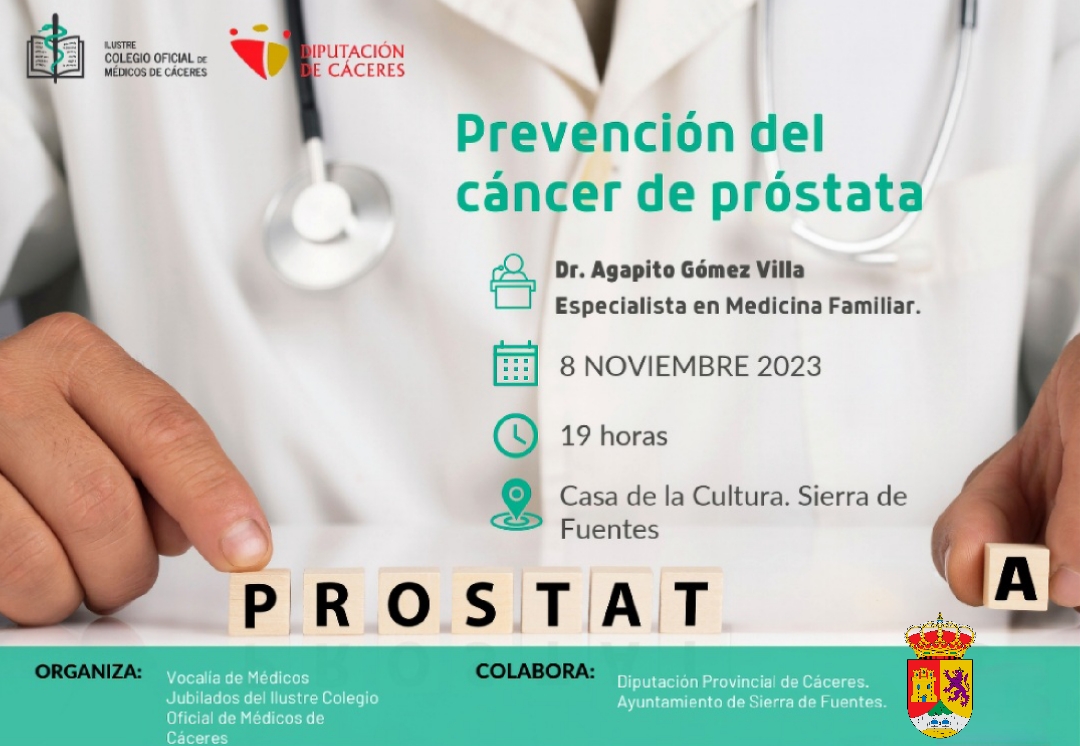 CHARLA DE PREVENCIÓN DEL CÁNCER DE PRÓSTATA2023-11-03 10:30:00Info GeneralSe informa que el próximo miércoles 8 de noviembre a las 19:00 en la Casa de Cultura se celebrará una Charla de Prevención del Cáncer de Próstata impartida por el Dr. Agapito Gómez Villa, Especialista en Medicina Familiar.