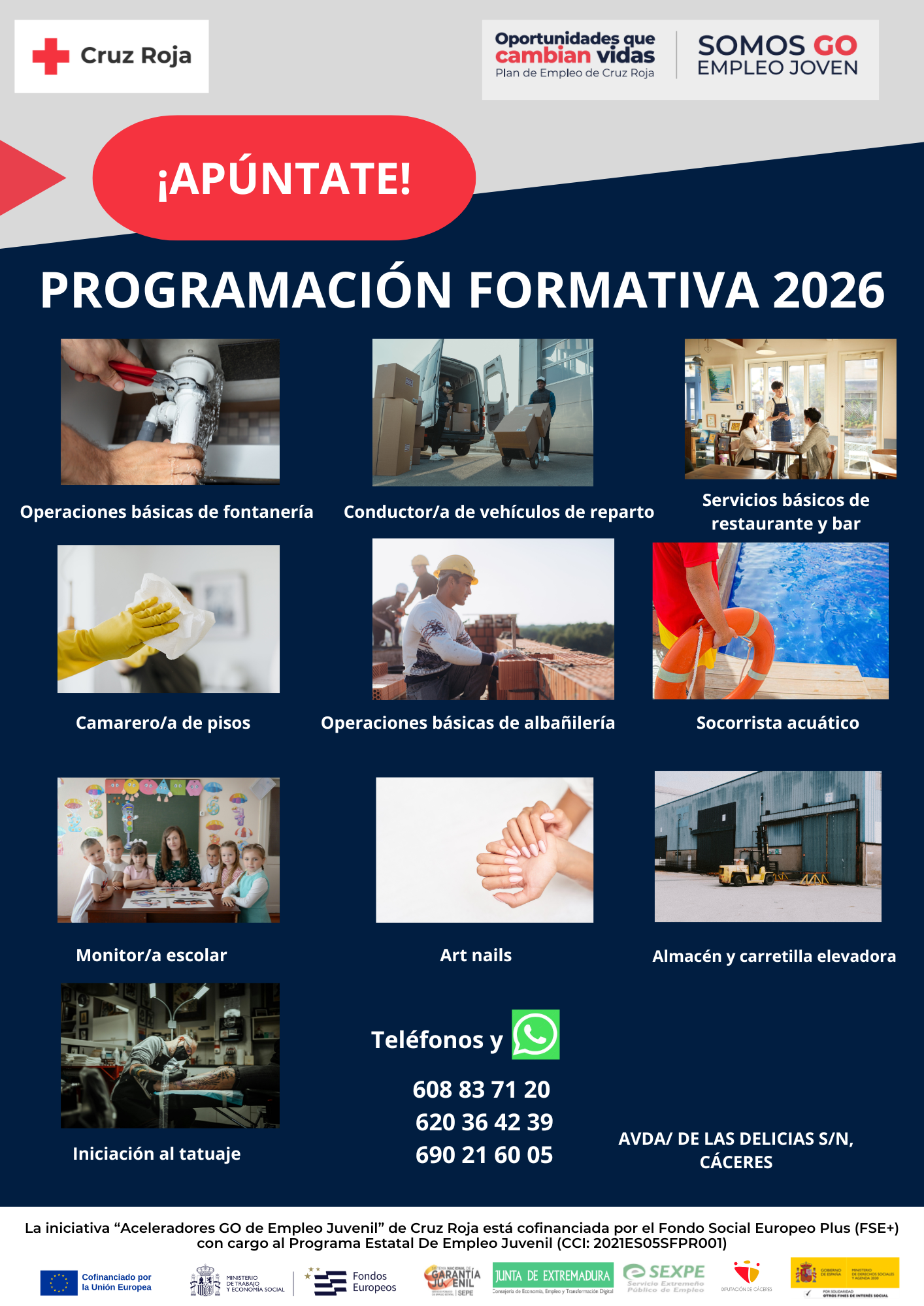 Desde la iniciativa "Aceleradores Go de Empleo Juvenil" de Cruz Roja, cofinanciado por el Fondo Social Europeo Plus (FSE ), con cargo al Programa Estatal de Empleo Juvenil (CCI: 2021ES05SFPR001) lanzamos nuevas Acciones Formativas para el año 2026. Adjuntamos el cartel de la formación planificada para el año 2026 y los carteles de las formaciones del primer trimestre: