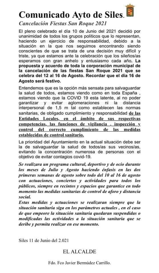 Tras el pleno celebrado ayer, por unanimidad de todos los grupos políticos que lo forman, haciendo un ejercicio de responsabilidad debido a la situación que nos seguimos encontrando COVID 19. Decidió la cancelación de las fiestas de agosto del 2021 .