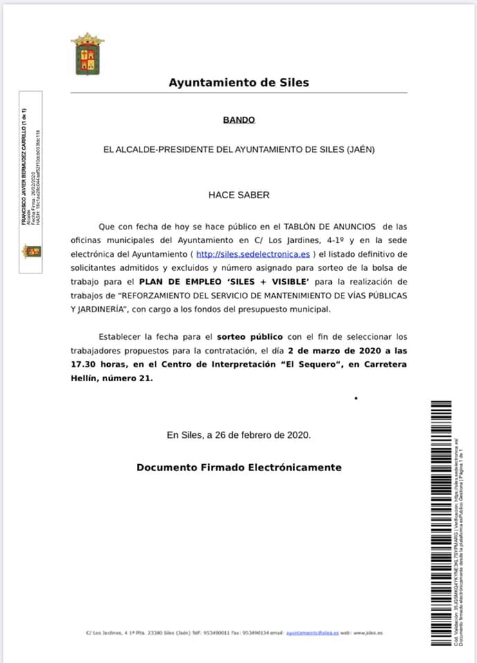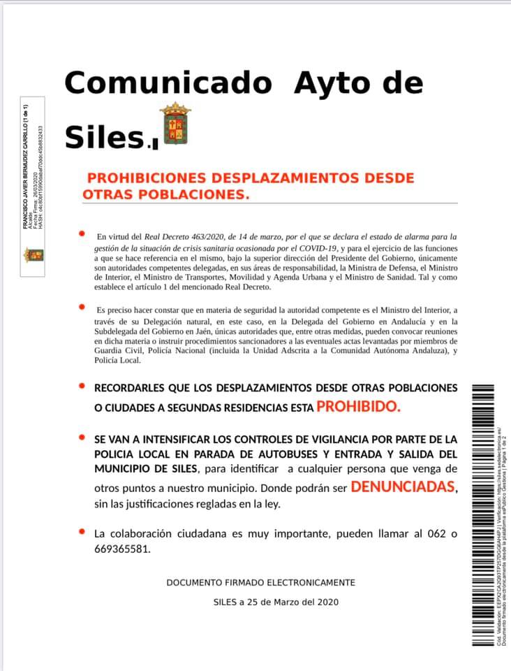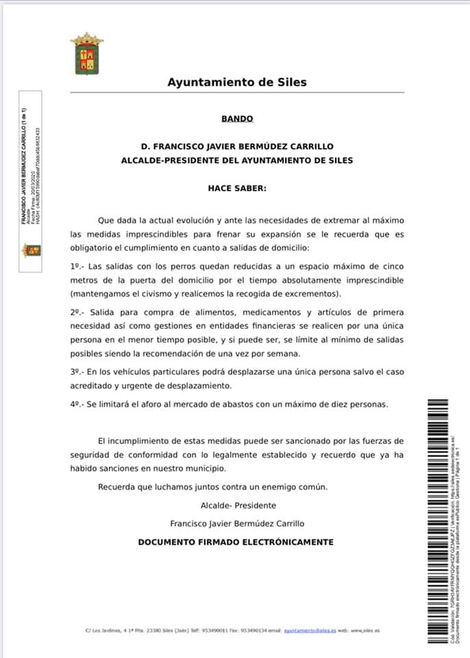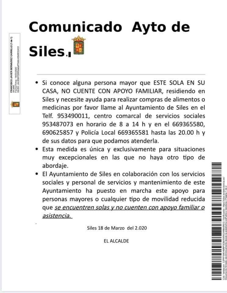 NUEVA E IMPORTANTE MEDIDA TOMADA POR EL EXCMO AYUNTAMIENTO DE SILES. Esta vez es destinada para el colectivo más vulnerable de nuestro pueblo en estos momentos como son NUESTR@S MAYORES. . Gracias al personal del Ayto , tanto de oficinas , policía local como mantenimiento y servicios por su colaboración .