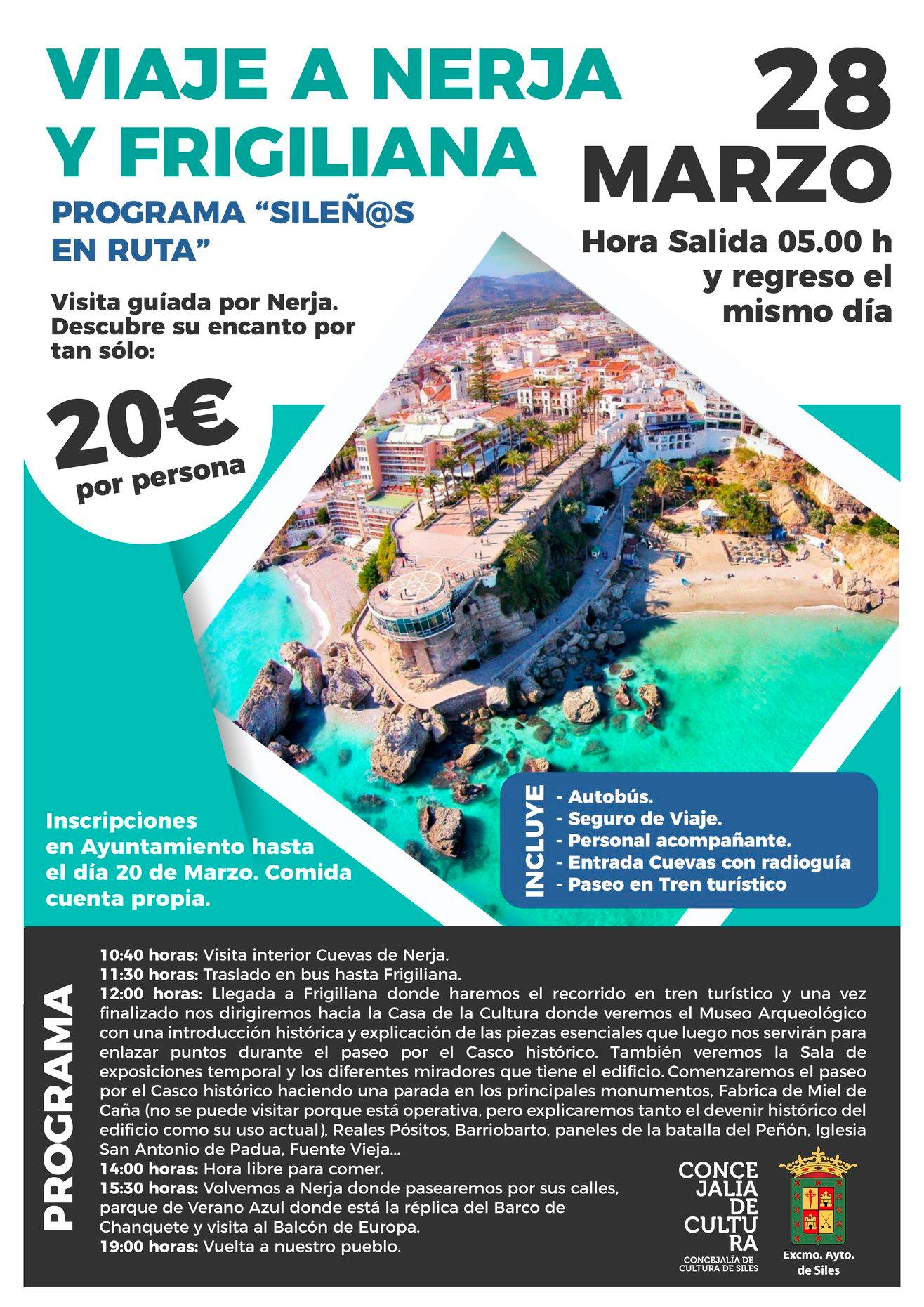 SILEÑ@S EN RUTA 2020 VUELVE A LA CARGA. Después de estos meses de aceituna y descanso, retomamos nuestro programa "SILEÑ@S EN RUTA", en esta ocasión nos vamos a NERJA Y FRIGILIANA. Plazo de Inscripción hasta el 20 de Marzo. Plazas Limitadas. Se paga el Viaje en el momento de inscripción, así como, facilitar .D.N.I y teléfono de contacto. ¿¿TE LO VAS A PERDER??