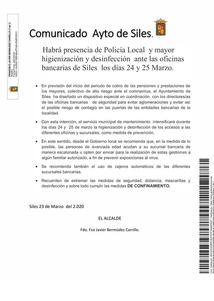 COMUNICADO MEDIDAS PREVENCIÓN EN SUCURSALES BANCARIAS DE SILES DEBIDO AL COBRO DE PENSIONES Y PRESTACIONES DIA 24 y 25 MARZO .