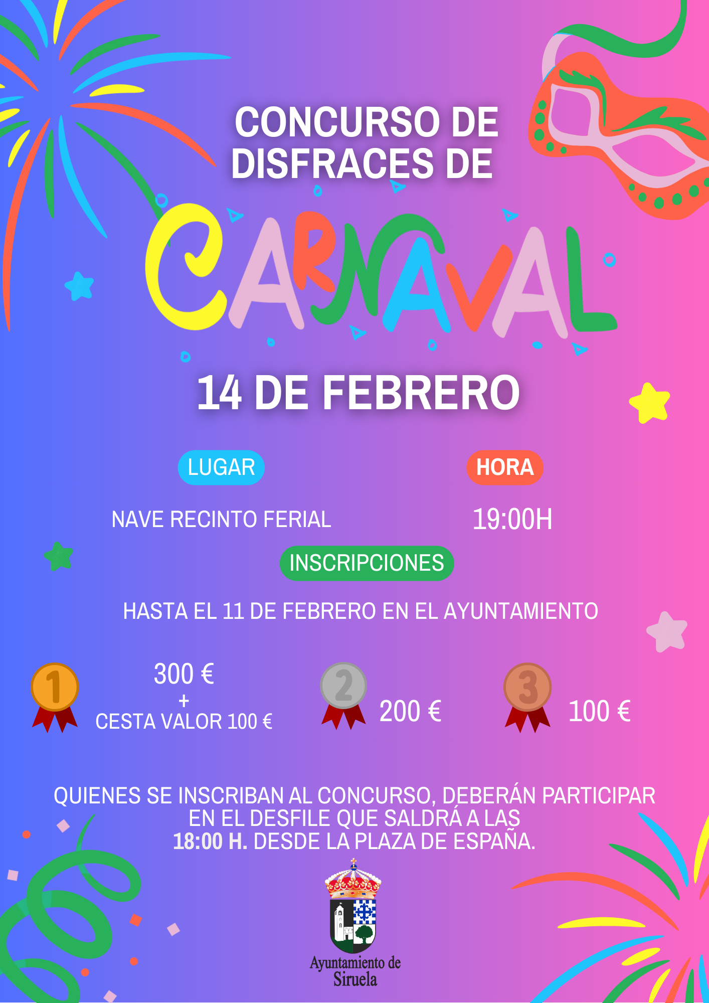 El Ayuntamiento de Siruela informa del Concurso de Disfraces de Carnaval, que se celebrará el 14 de febrero a las 19:00 h en la Nave del Recinto Ferial.
