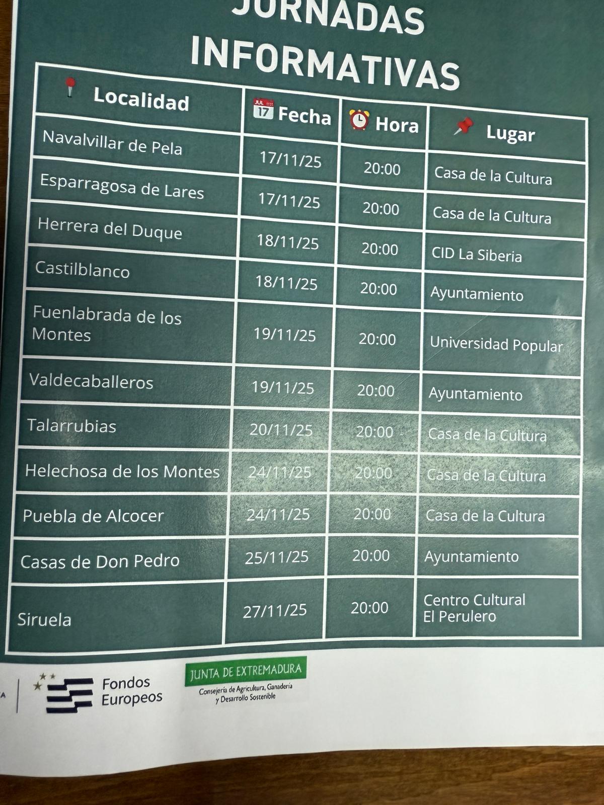 Los días 13, 14, 17, 18 y 19 de noviembre de 16:00 a 20:00 en la Biblioteca de la Casa de la Cultura, y los días 17,18 y 19 de 11:00 a 14:00 en el Ayuntamiento de Siruela.