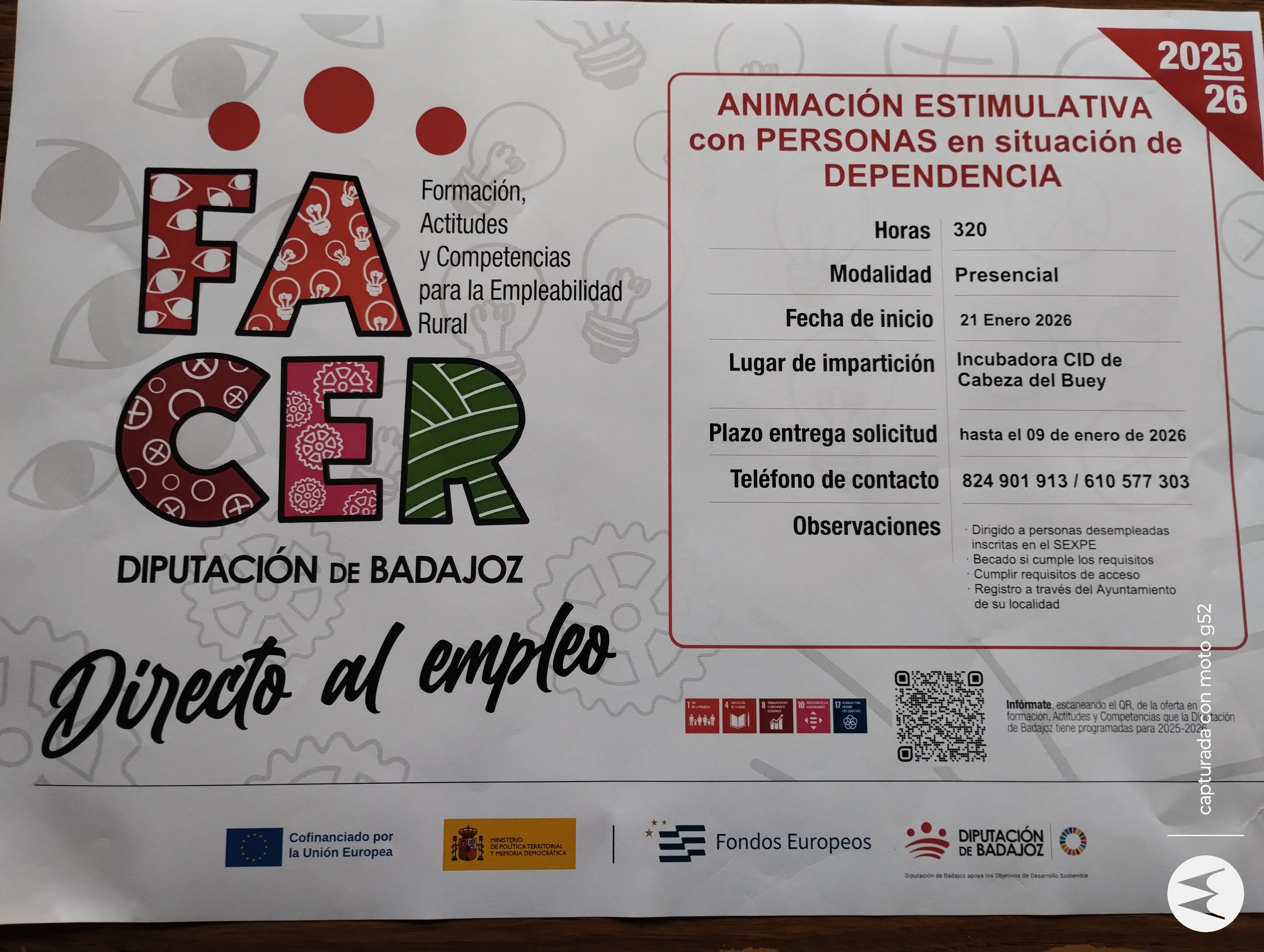 Formación para el empleo2024-04-02 10:00:00EmpleoDisponibles nuevo curso de FORMACÍON, ACTITUDES Y COMPETENCIAS PARA LA EMPLEABILIDAD RURAL (FACER) de Diputación de Badajoz para personas desempleadas inscritas en el SEXPE, 320 horas en modalidad presencial que se impartirá en CID de Cabeza del Buey desde el 21 de Enero de 2026. Dicho curso puede ser becado si cumple los requisitos y el plazo de entraga de solicitud será hasta el 9 de enero de 2026 a través del Ayuntamiento.