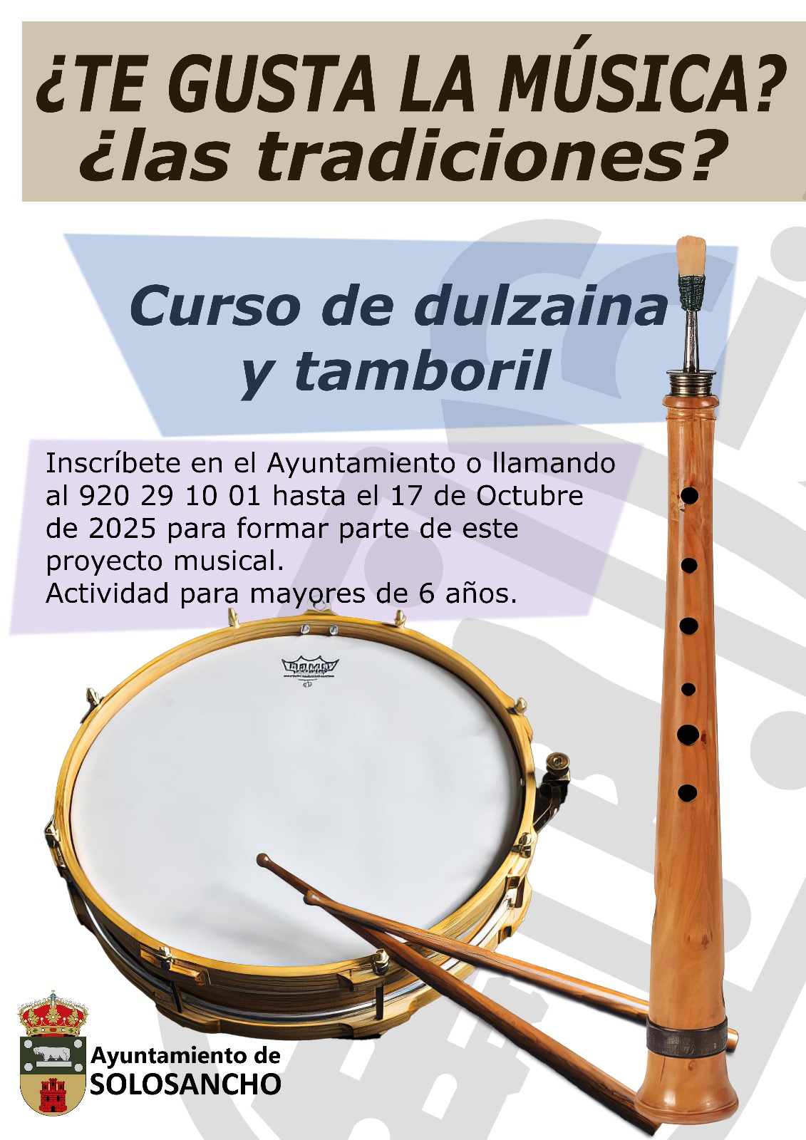 De gran importancia es la música por eso y, por primera vez, queremos dar la oportunidad a nuestros vecinos y vecinas de aprender a tocar los instrumentos que llevan siglos sonando en nuestros pueblos: LA DULZAINA (gaitilla) y el tamboril.