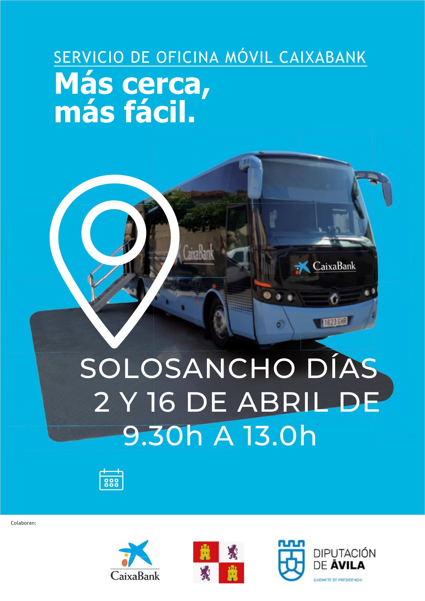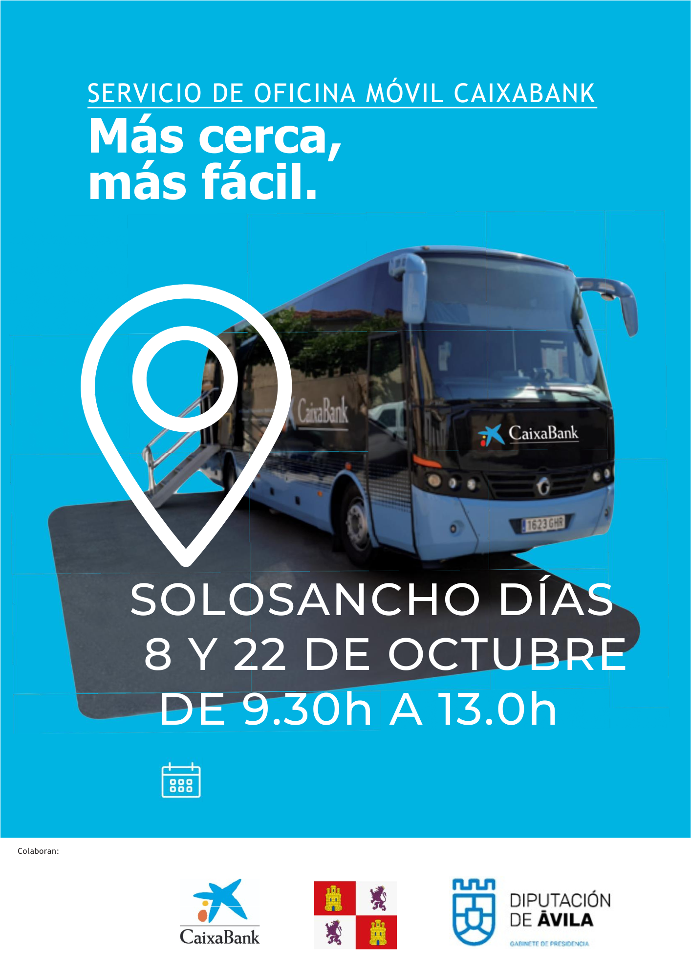 Se informa a todos los vecinos que los miércoles 8 Y 22 de OCTUBRE estará en SOLOSANCHO el servicio de oficina móvil de Caixabank, prestando sus servicios habituales a las 9:30 horas.
