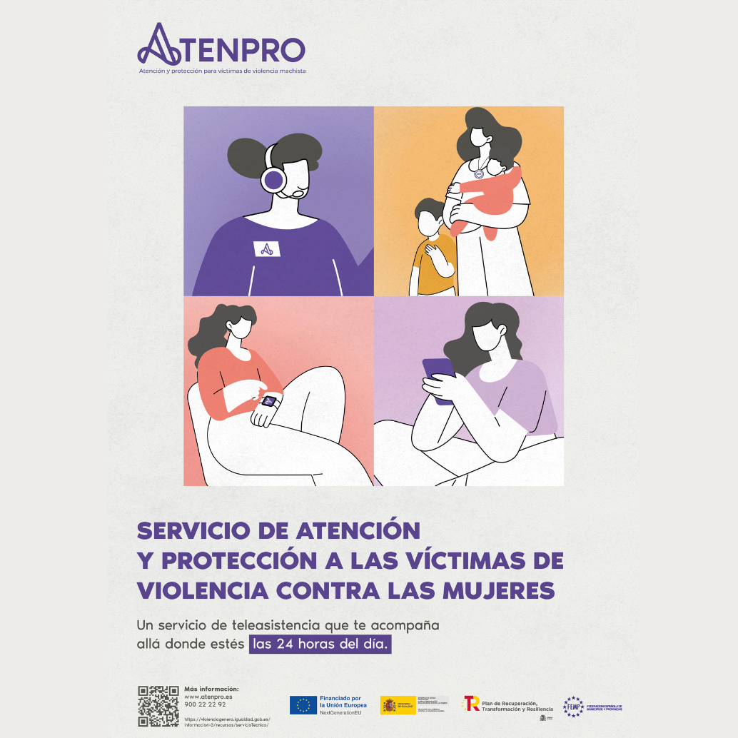 ATENPRO es un servicio de teleasistencia gratuito dirigido a mujeres víctimas de violencia, que ofrece respuesta inmediata 24 horas al día, los 365 días del año.