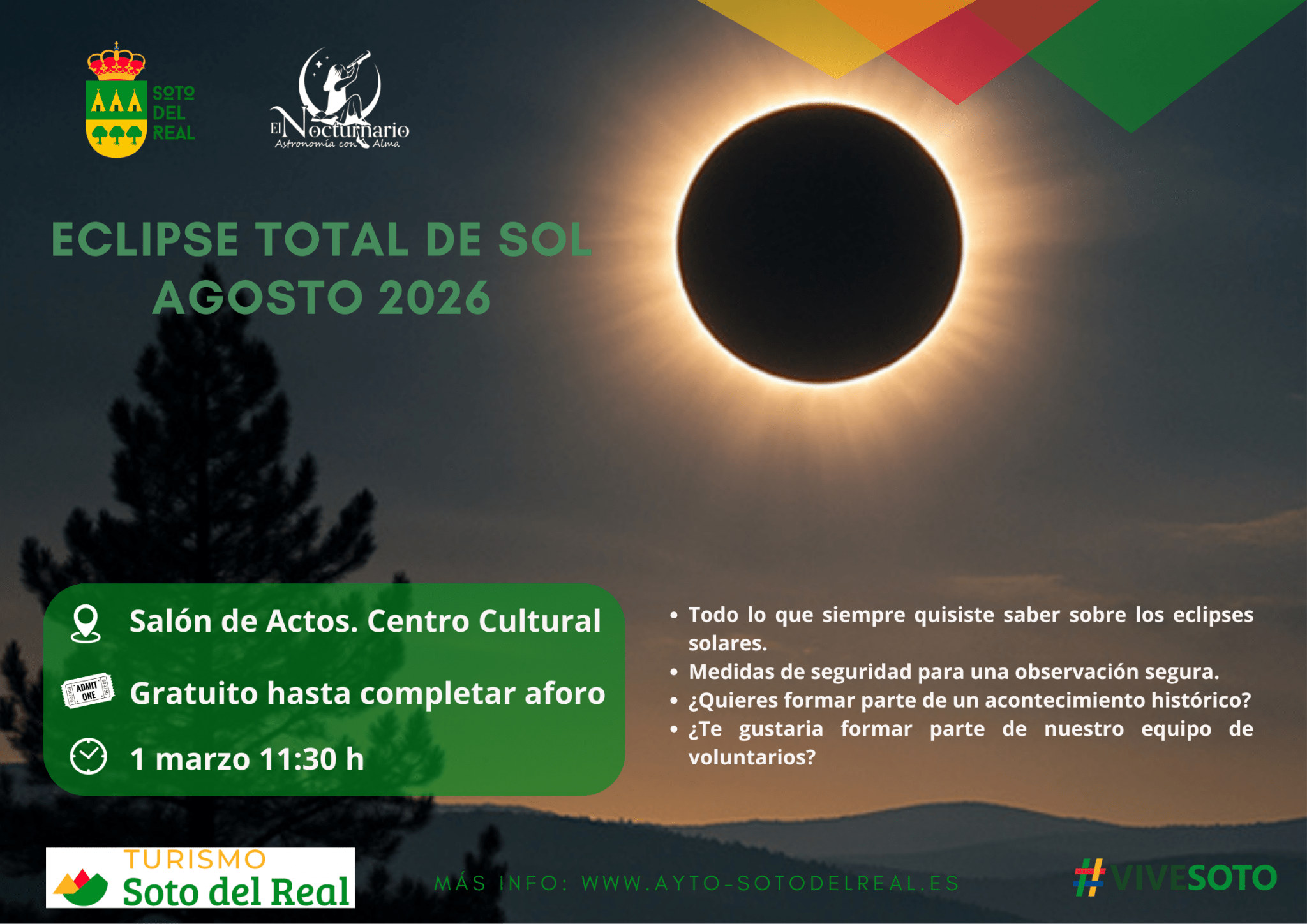 El próximo 12 de agosto viviremos en Soto un acontecimiento histórico: un eclipse solar total. Para prepararnos y resolver todas nuestras dudas, hemos organizado una charla divulgativa.