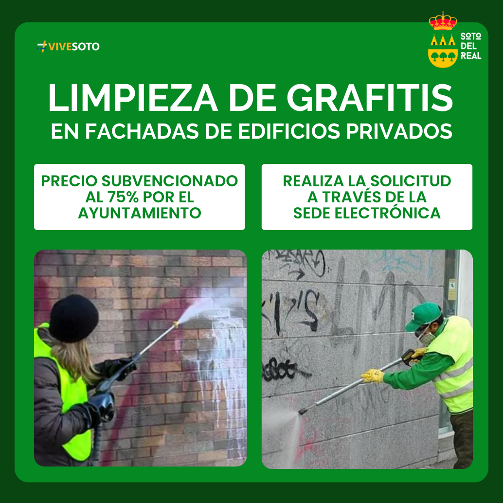 Desde el Ayuntamiento de Soto del Real ponemos a disposición de nuestros vecinos, vecinas y comercios un servicio de limpieza de fachadas para edificios privados afectados por pintadas o grafitis.
