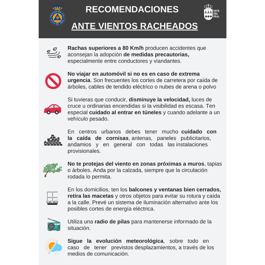 Desde el Ayuntamiento os pedimos extremar la precaución durante las próximas horas y seguir las recomendaciones que aparecen en la imagen para evitar riesgos y posibles incidencias.