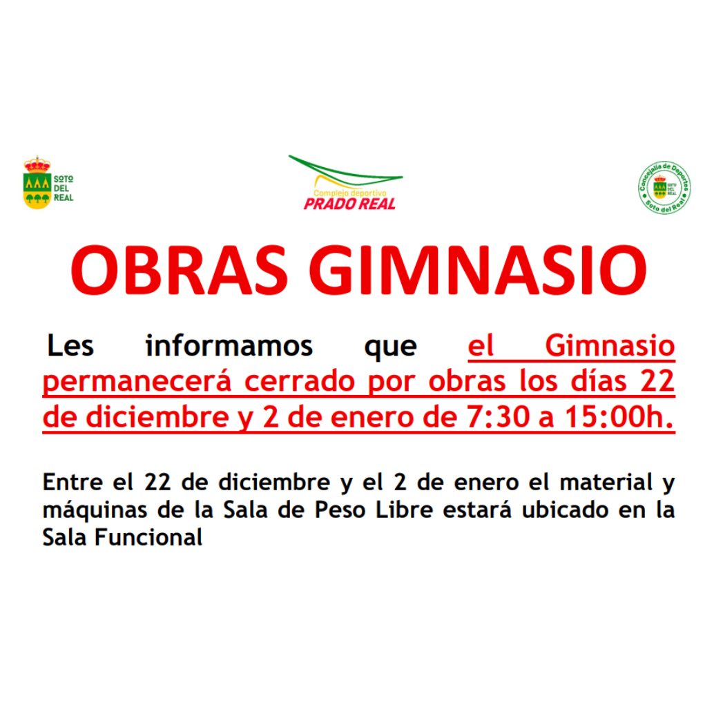 Con motivo de obras de mejora, los días 22 de diciembre y 2 de enero, en horario de 7:30 a 15:00 h, el espacio de gimnasio permanecerá cerrado.