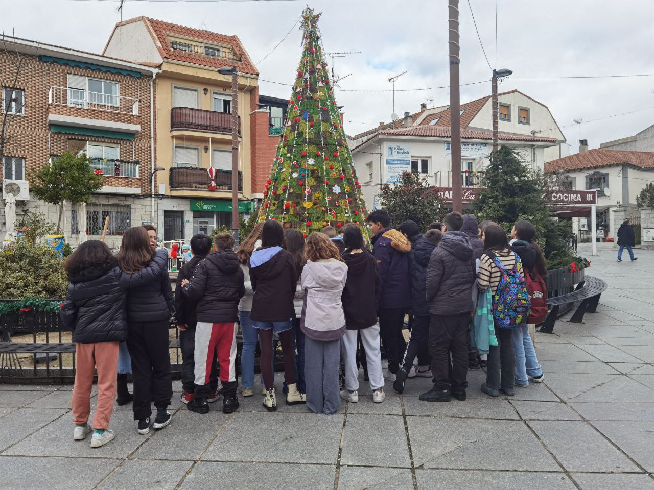 Parte del alumnado del IES Sierra de Guadarrama ha visitado estos días el árbol de ganchillo de la Plaza de la Villa, donde han podido ver de cerca el resultado de un trabajo en el que ellos mismos han participado, creando algunos de los adornos navideños de este año, como los coloridos pompones que decoran el árbol.