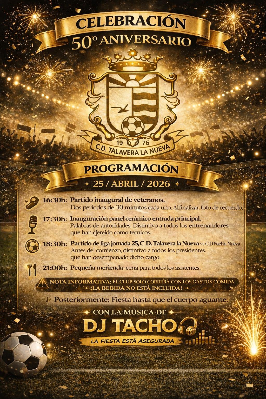El próximo día 25 de abril el C.D. Talavera la Nueva celebra el 50 aniversario de su fundación. Al ser una fecha tan señalada os invitamos a todos a participar en los actos programados: